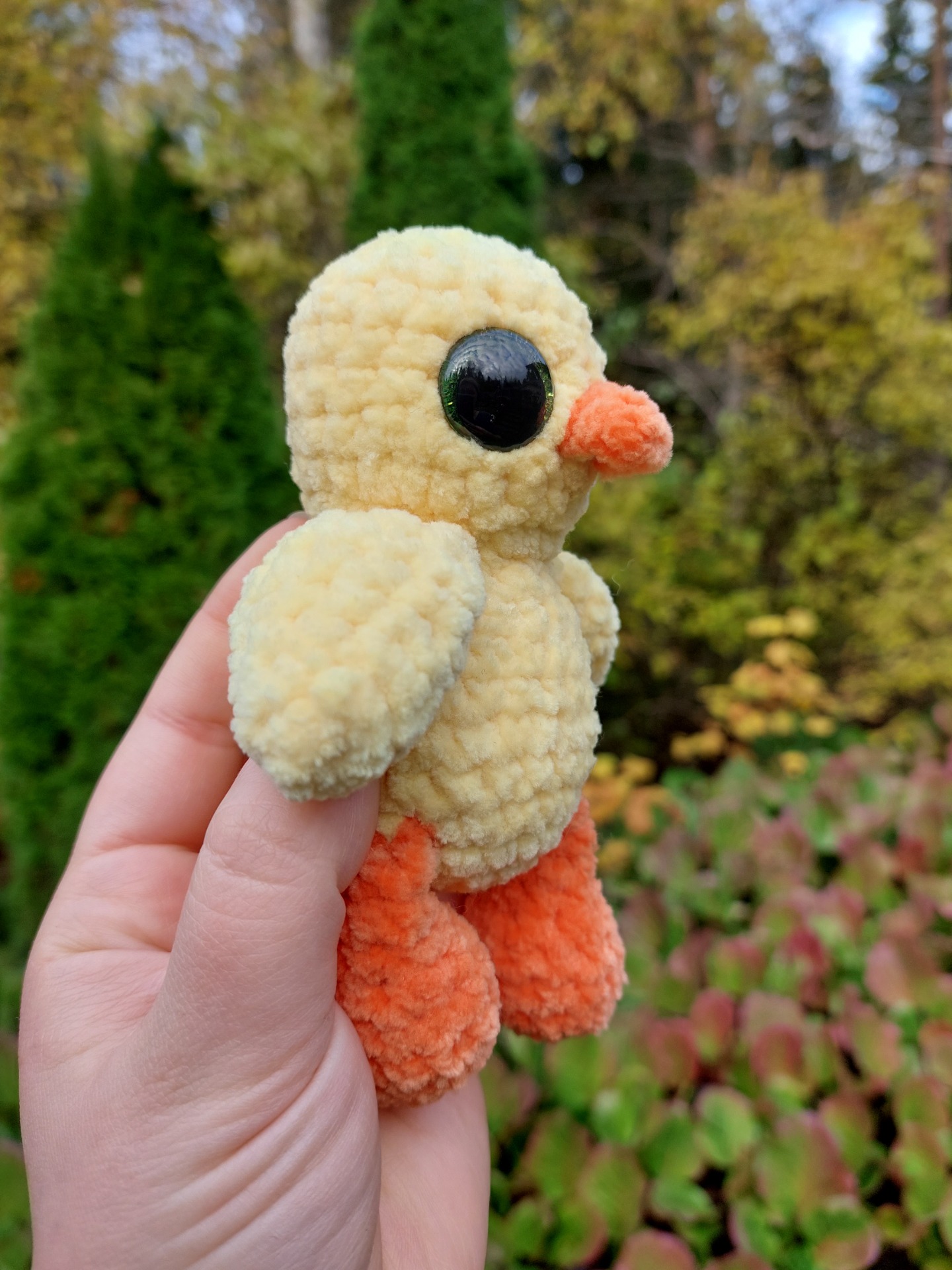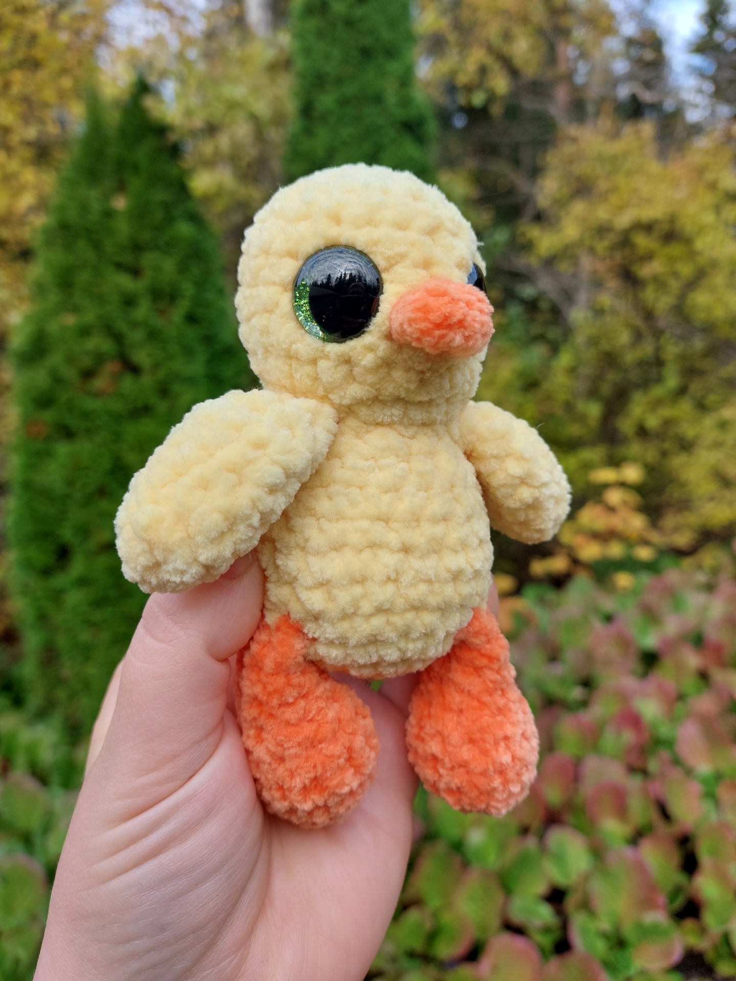 Pehmeä keltainen ankka pehmolelu kimaltavilla glitter silmillä.