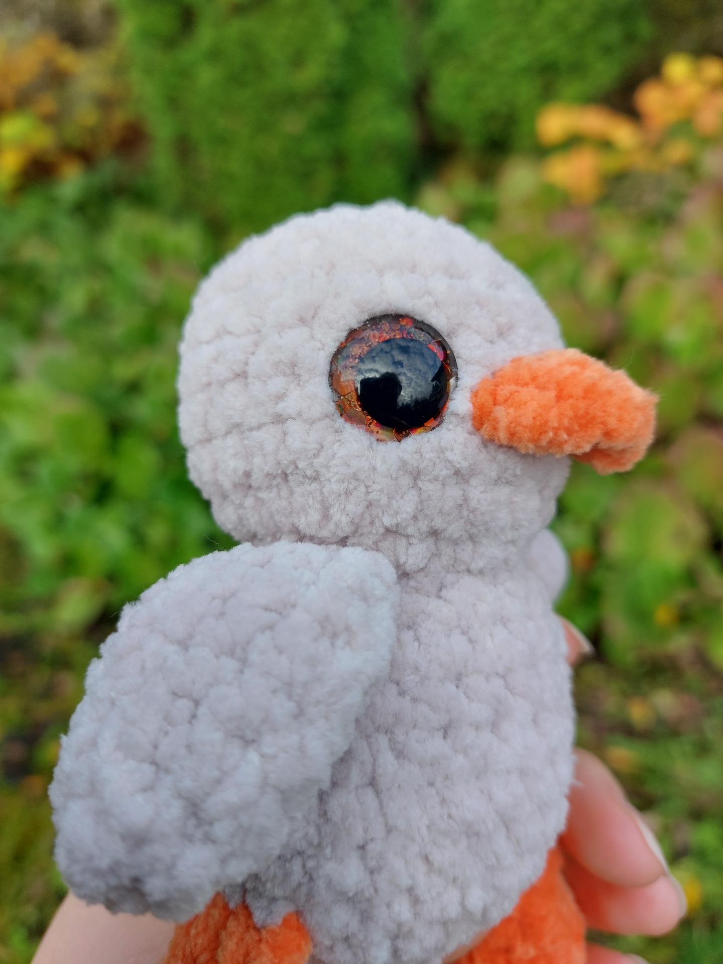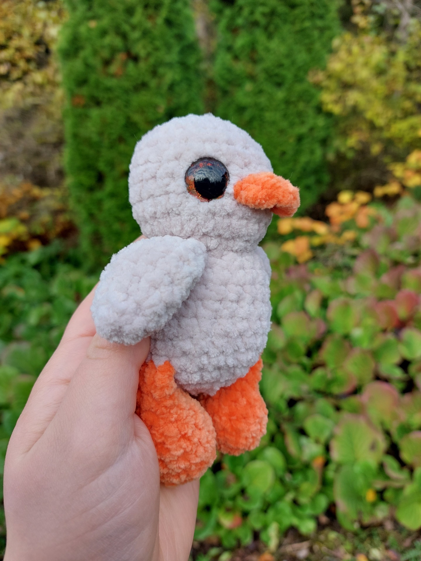 Pehmeä harmaan beige ankka pehmolelu kimaltavilla glitter silmillä.
