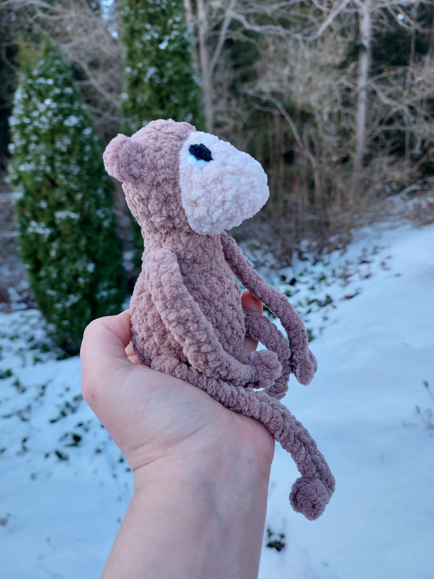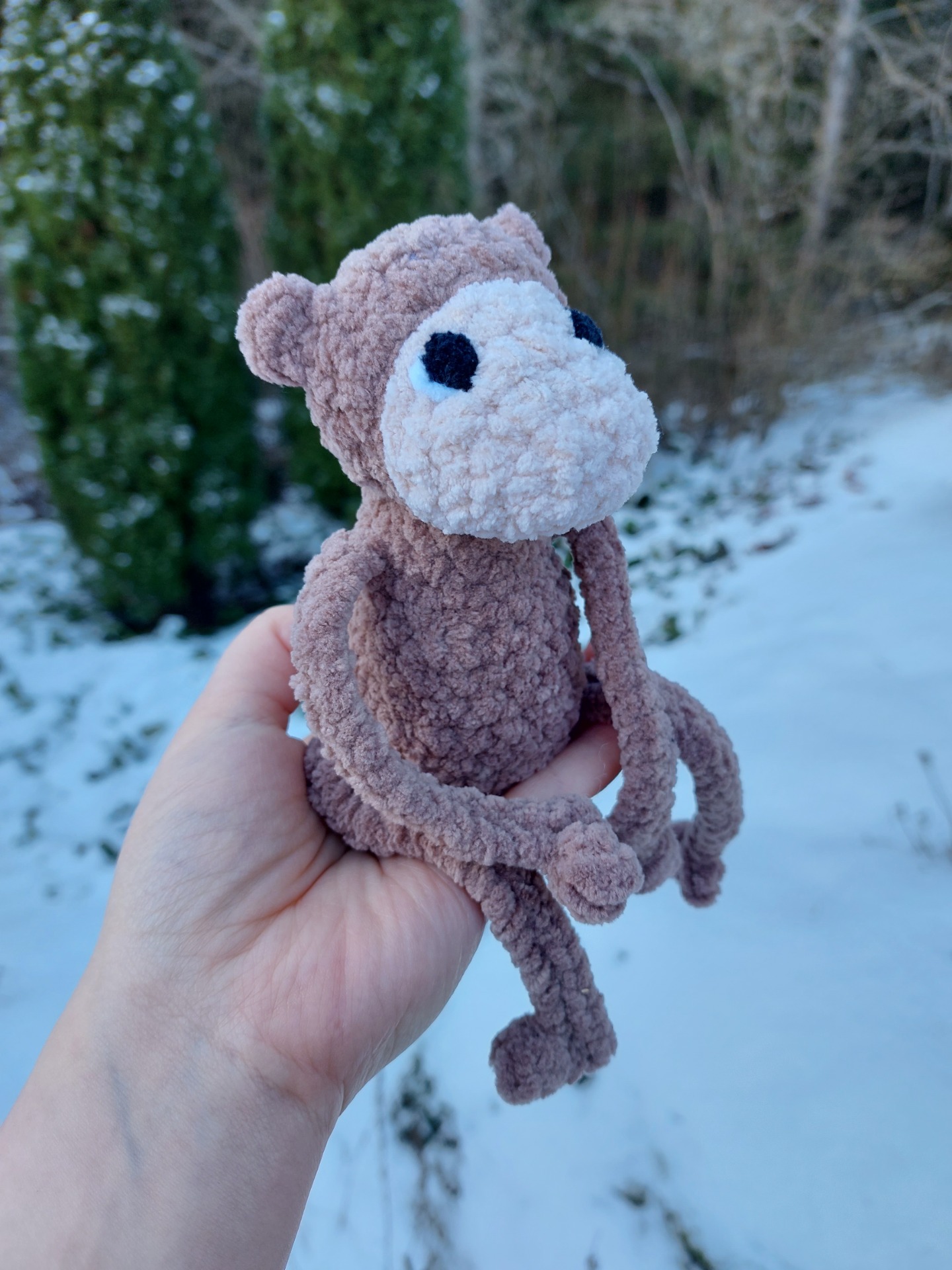 Pehmeä apina pehmolelu. Langalla Oeko-tex sertifikaatti ja täytevanu soveltuu myös allergikoille. Tällä apinalla on vauvoille turvalliset lankasilmät.