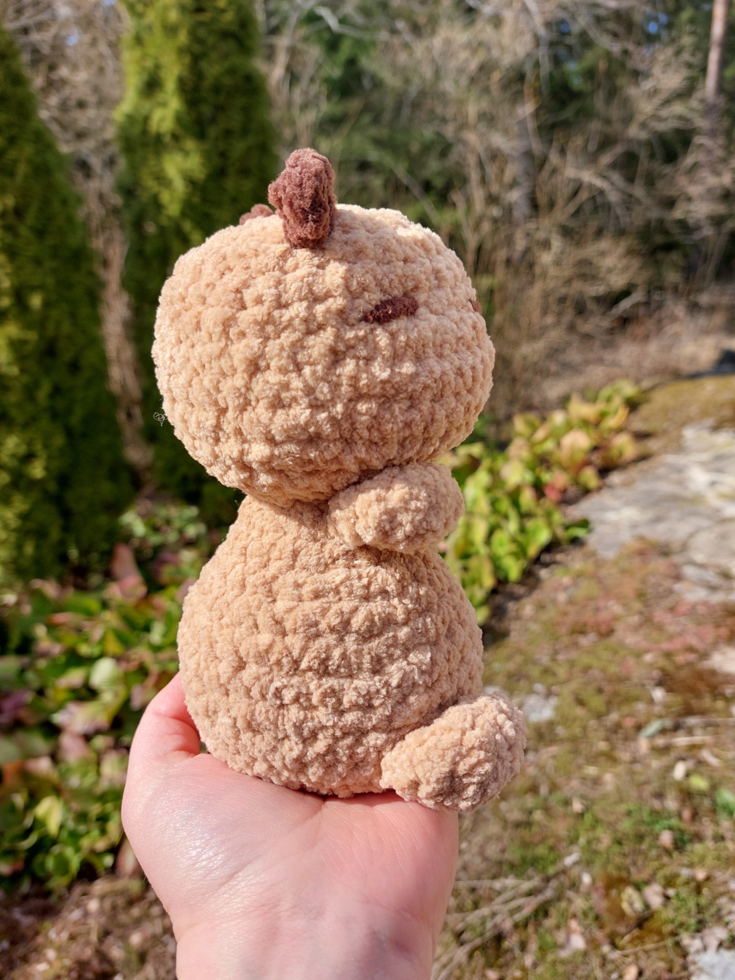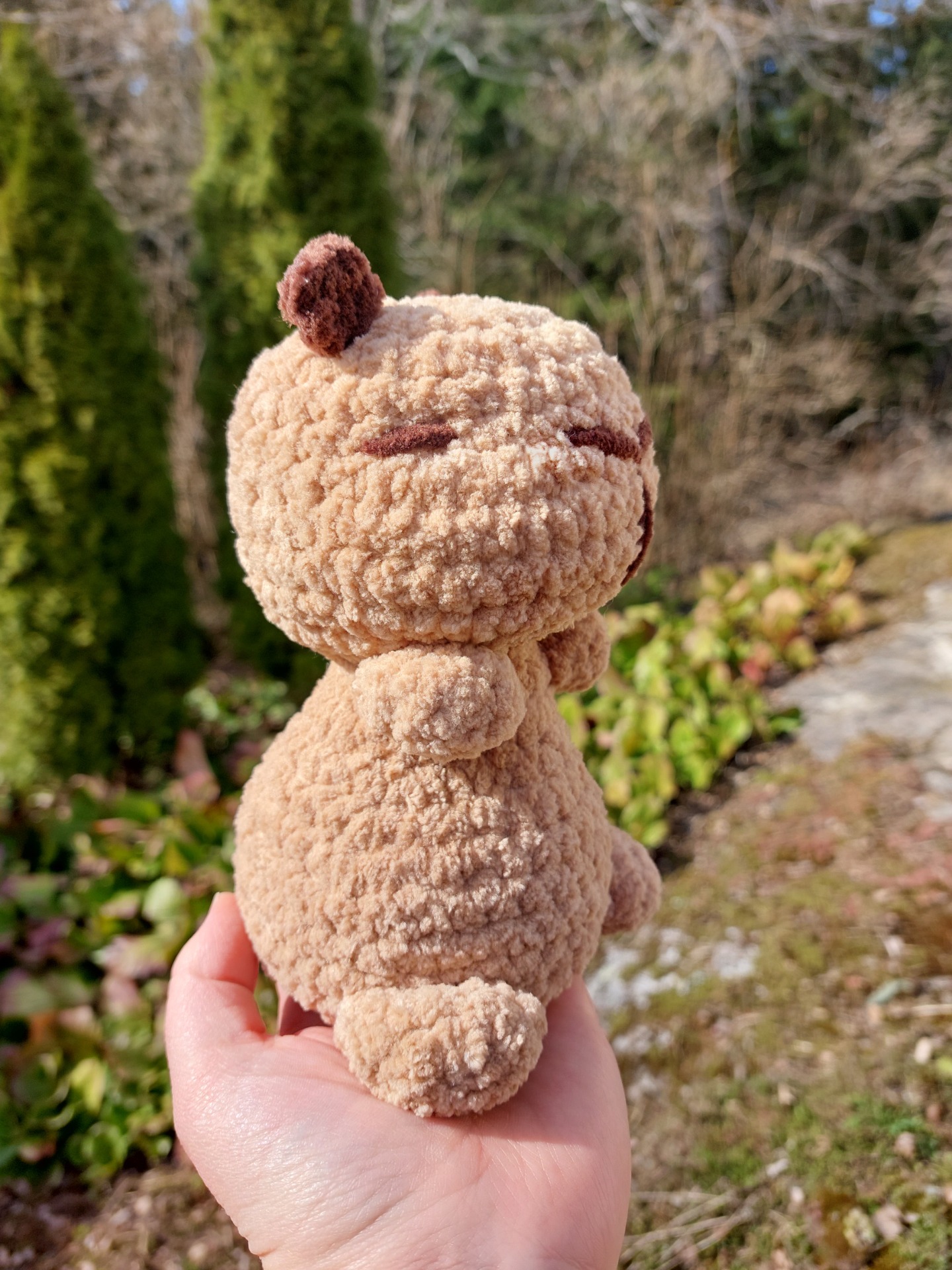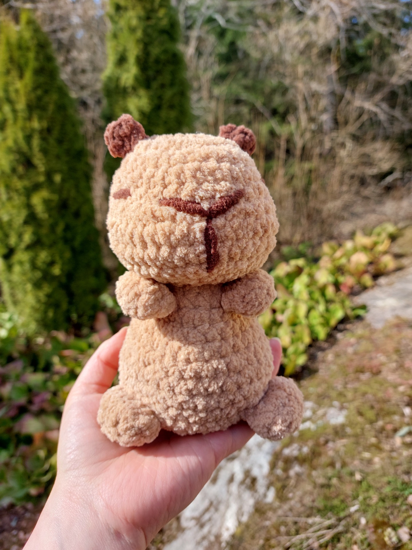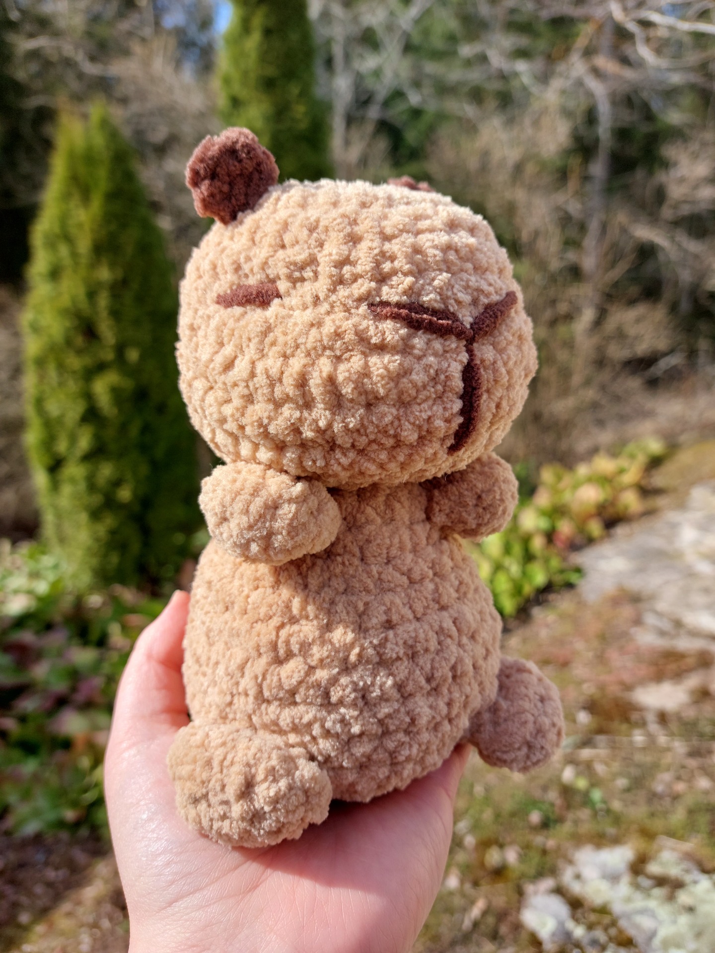 Suloinen capybara pehmolelu jonka vartalo on täytetty painorakeilla ja päässä on täytevanua. Silmät ovat tehty langasta.