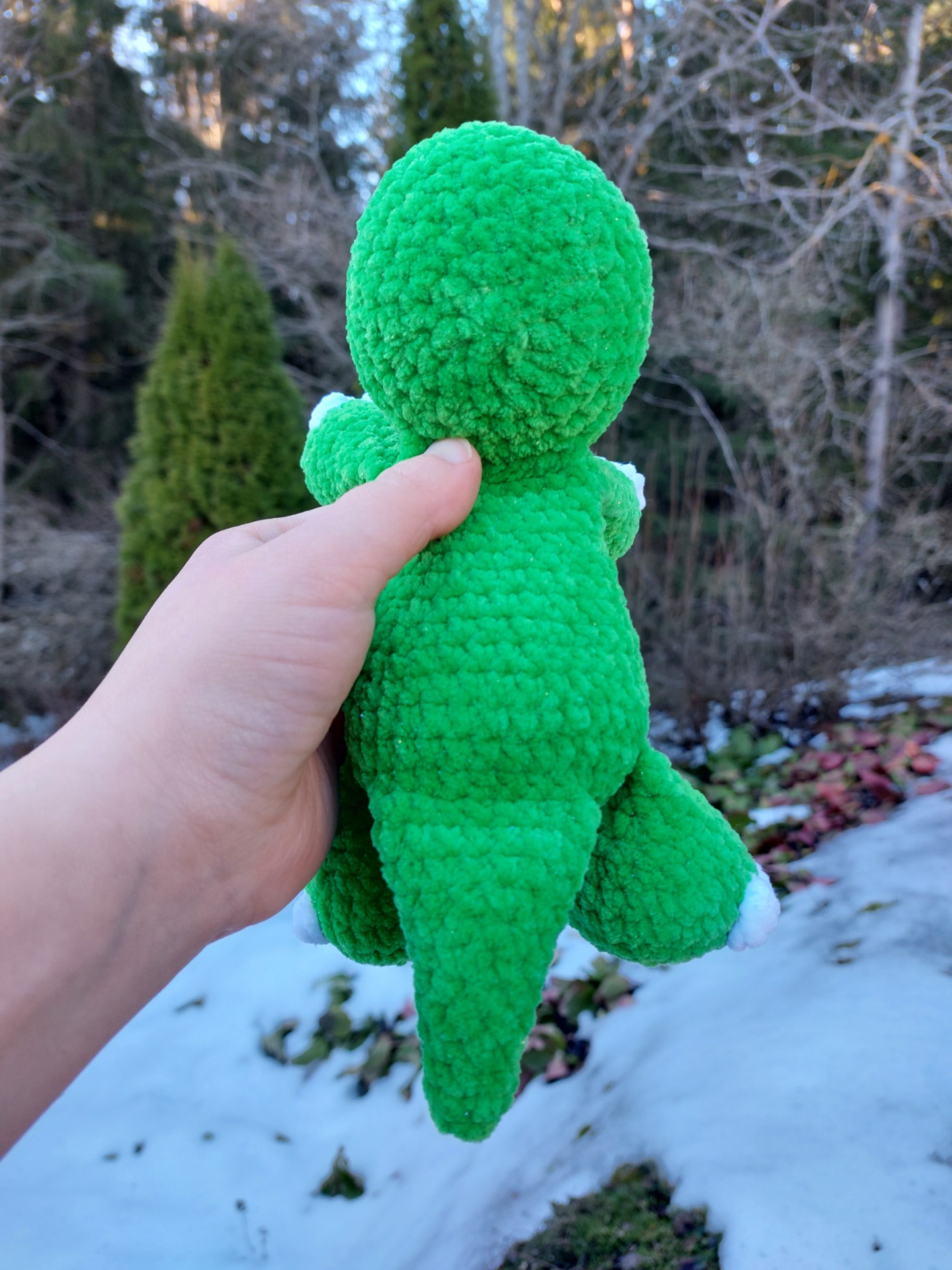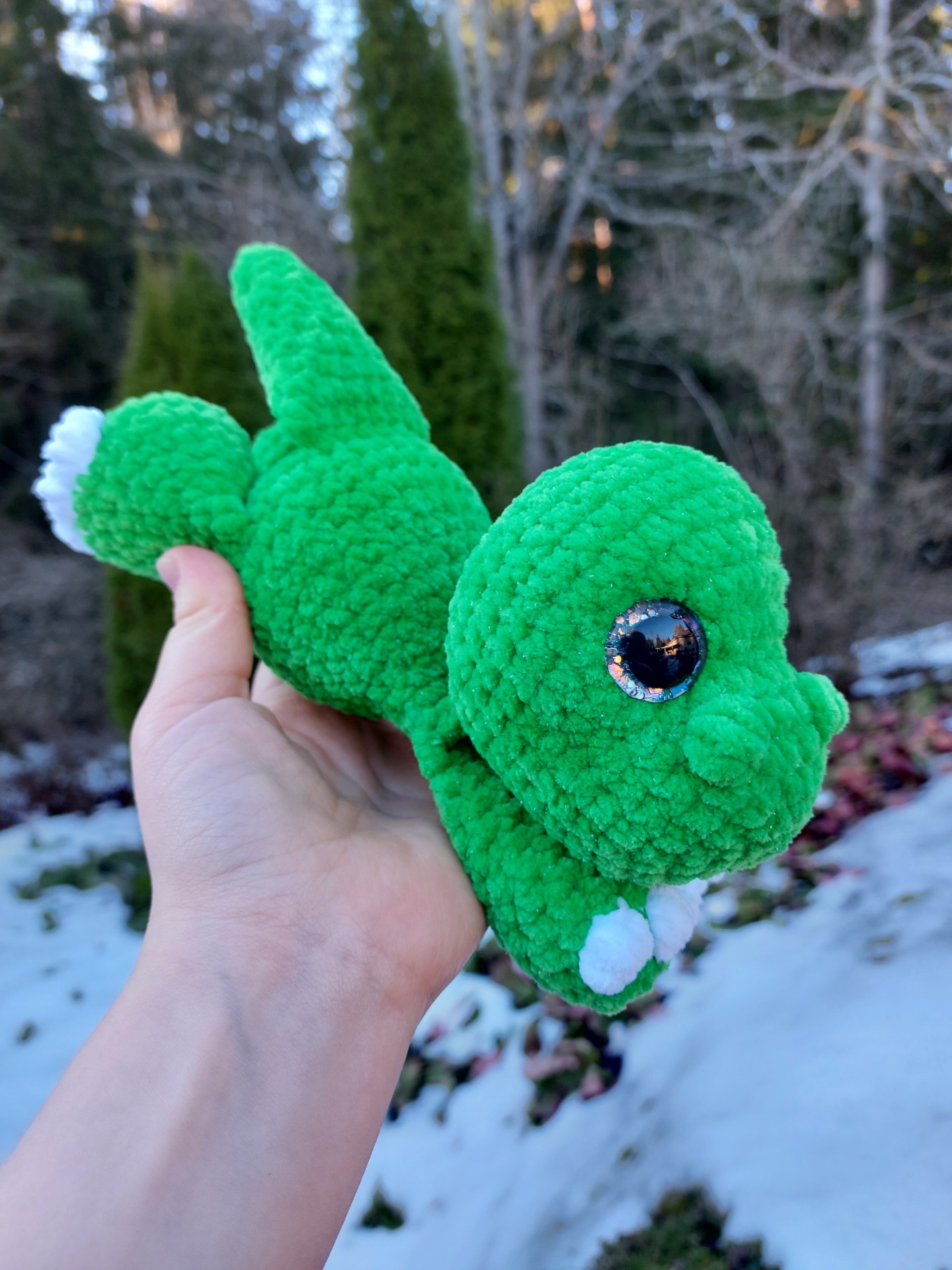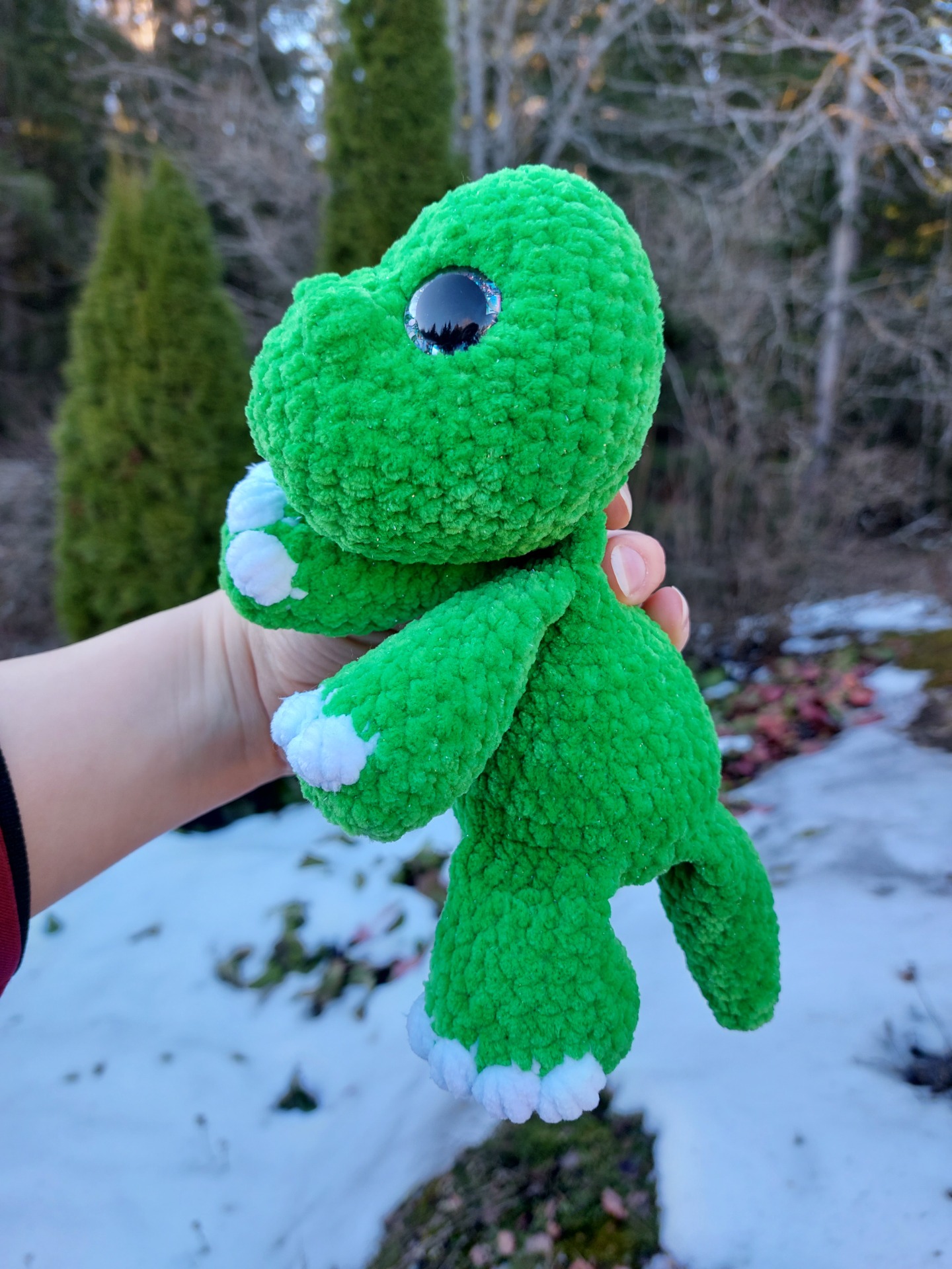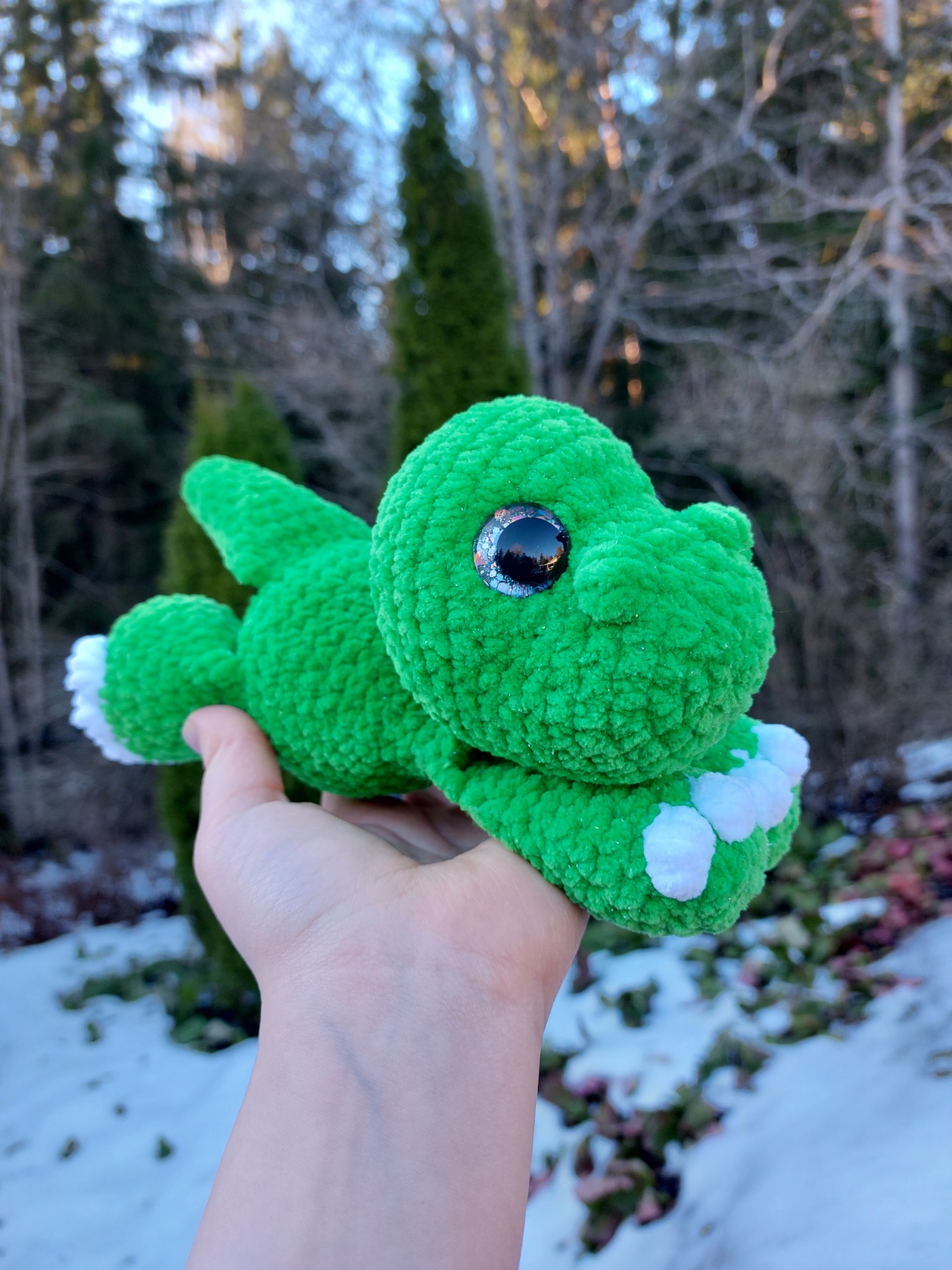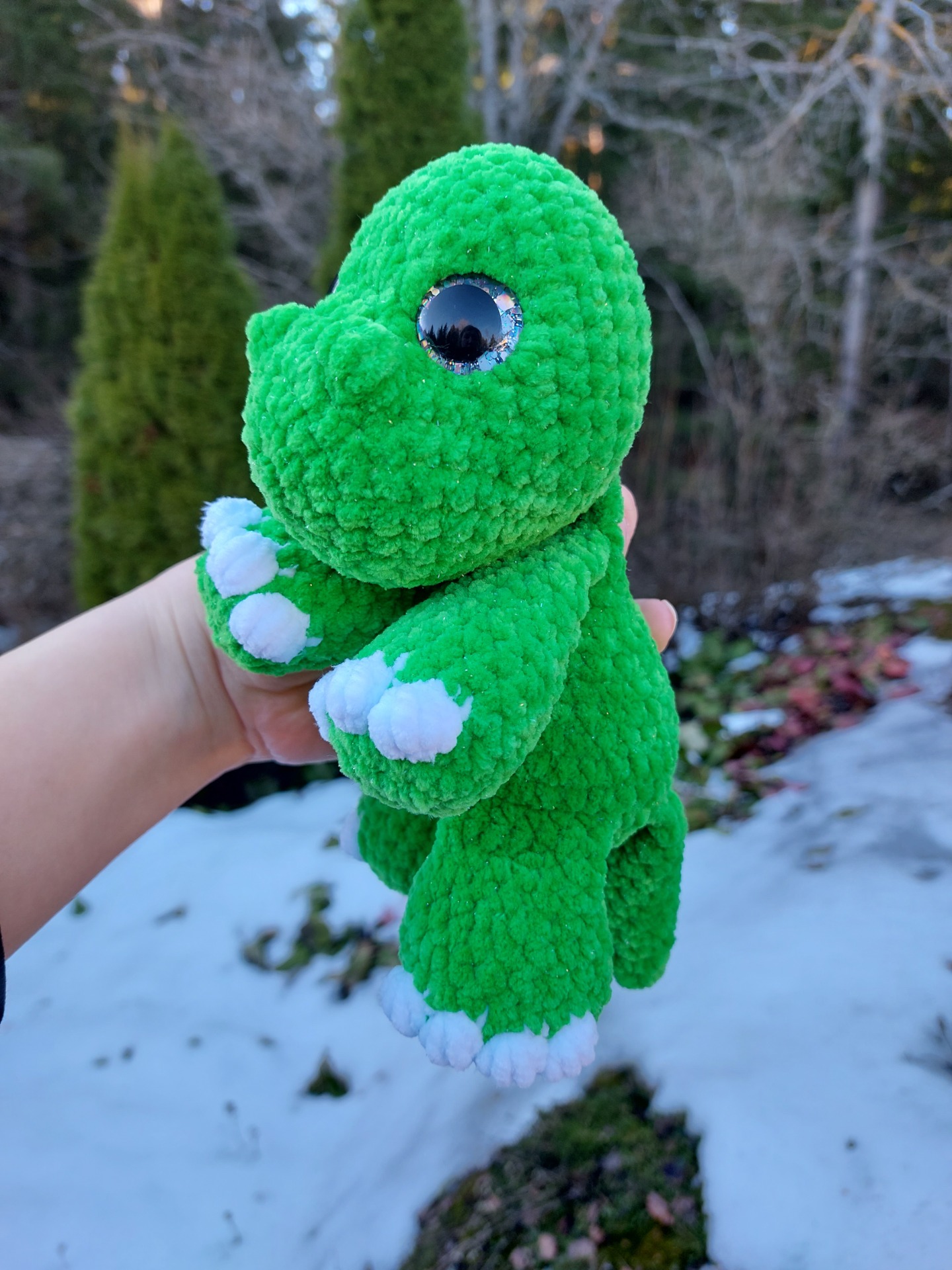 Vihreä dinosaurus pehmolelu isoilla hopeanvärisillä glitter silmillä. Pehmolelun vihreä lanka kimaltelee valossa. Liikutettavan pään ja jalkojen ansiosta sen voi laittaa myös istumaan tai makaamaan. Langalla Oeko-tex sertifikaatti ja täytevanu soveltuu myös allergikoille.