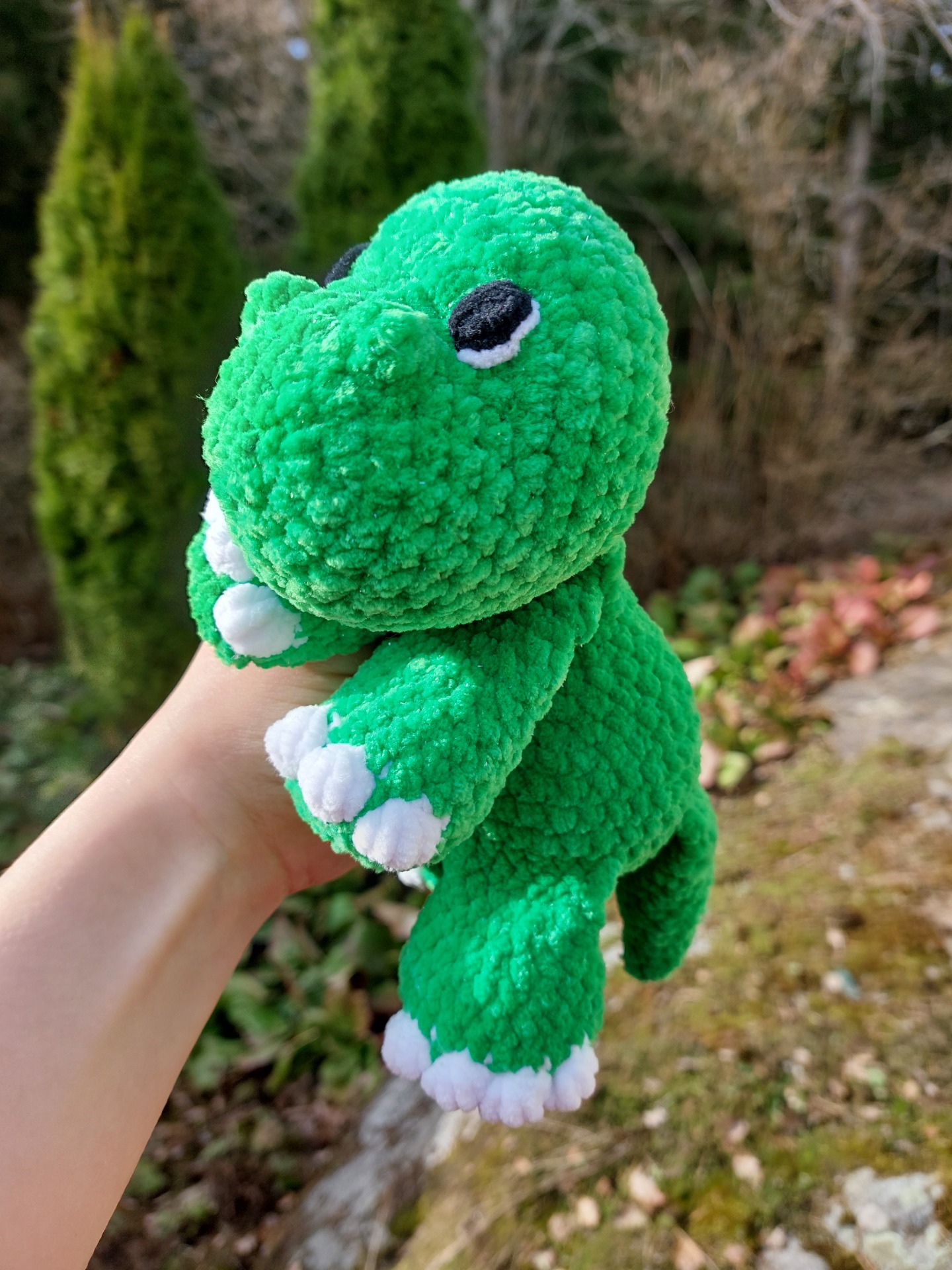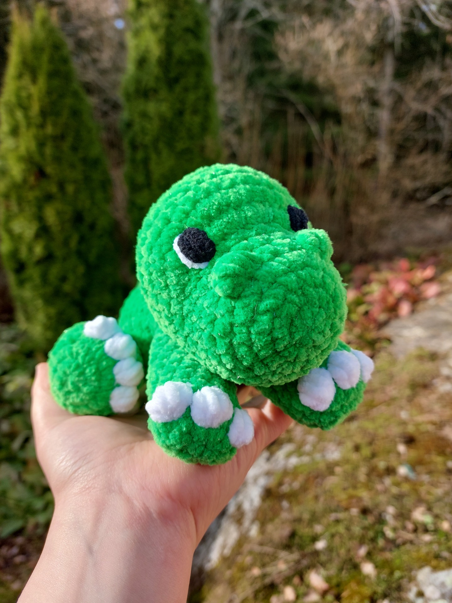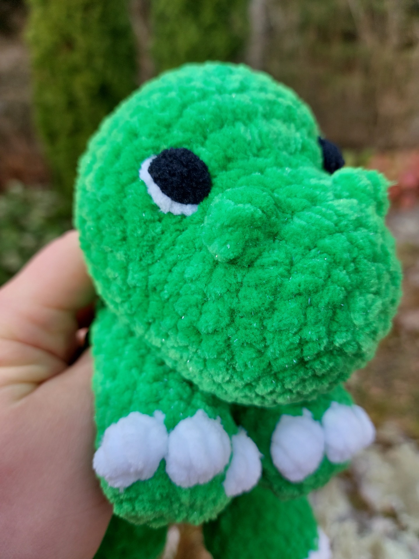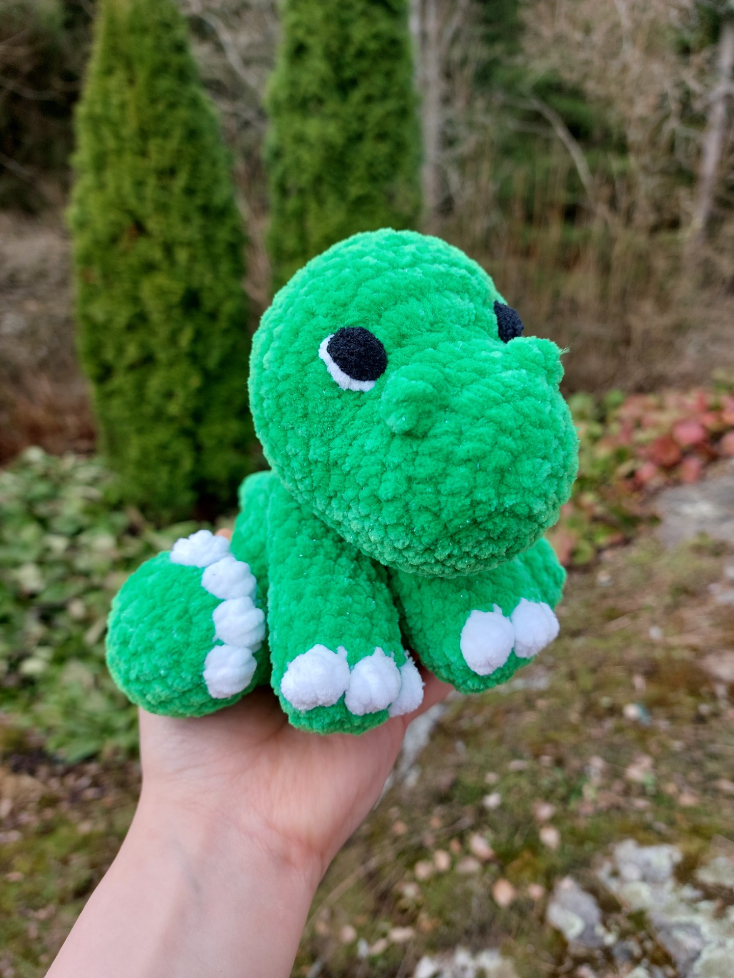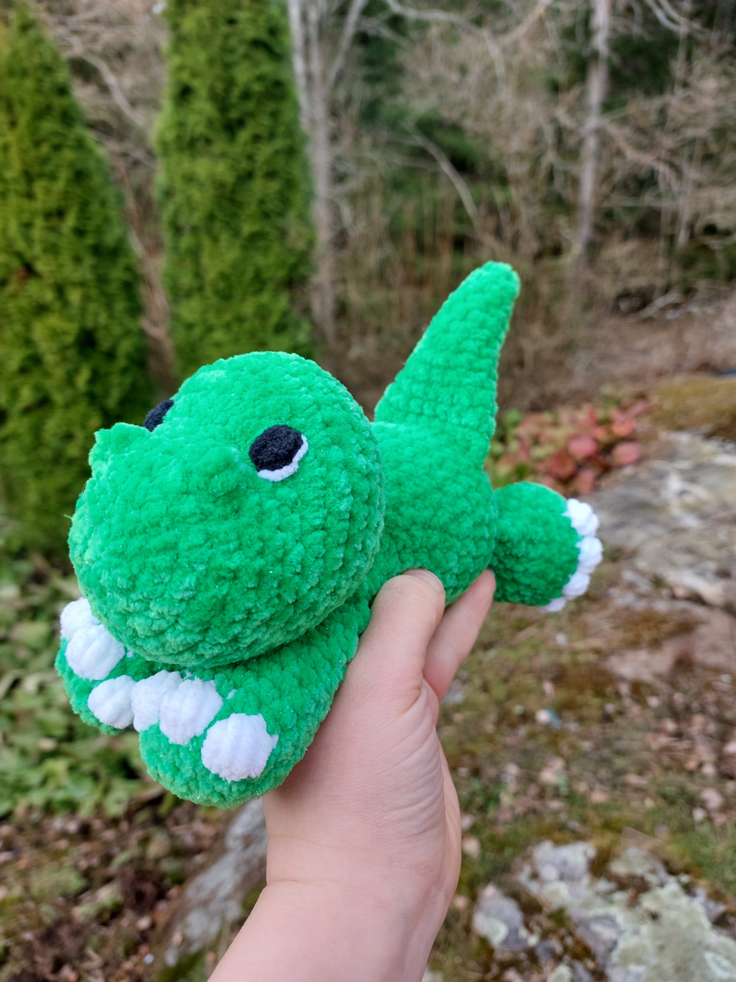 Vihreä dinosaurus pehmolelu vauvoille turvallisilla lankasilmillä. Pehmolelun vihreä lanka kimaltelee valossa. Liikutettavan pään ja jalkojen ansiosta sen voi laittaa myös istumaan tai makaamaan. Langalla Oeko-tex sertifikaatti ja täytevanu soveltuu myös allergikoille.