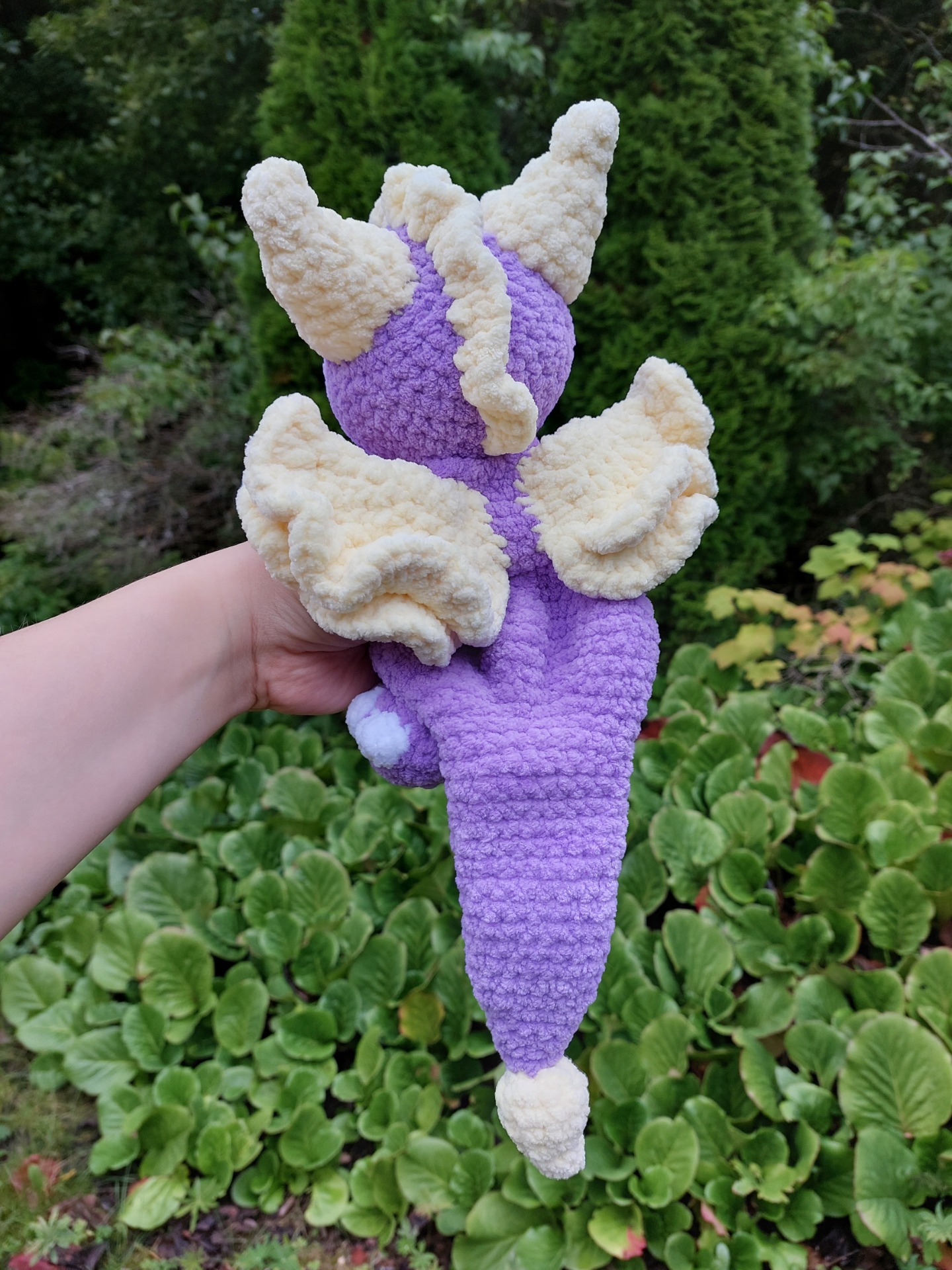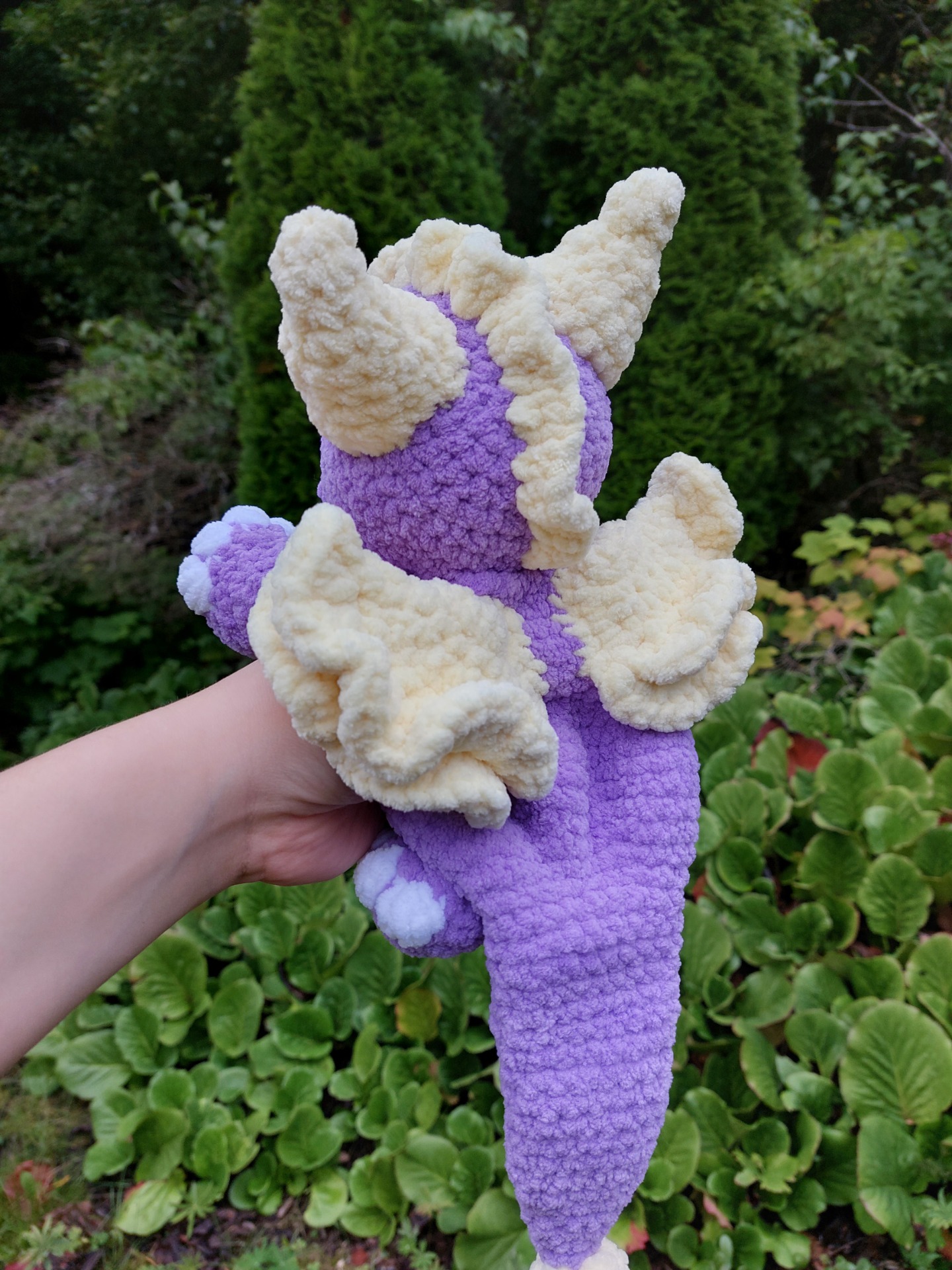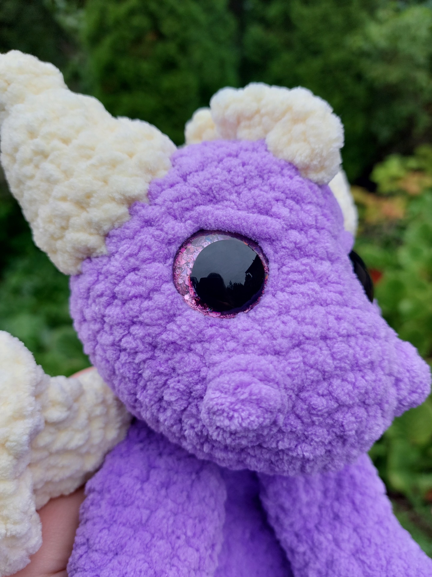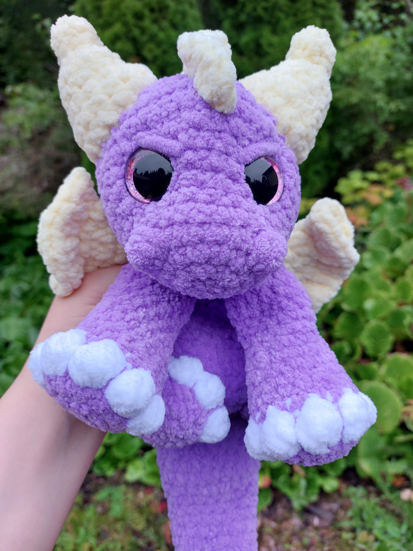 Iso violetin värinen ihanan pehmeä lohikäärme uniriepu.Langalla on Oeko-tex sertifikaatti ja täytevanu soveltuu myös allergikoille.