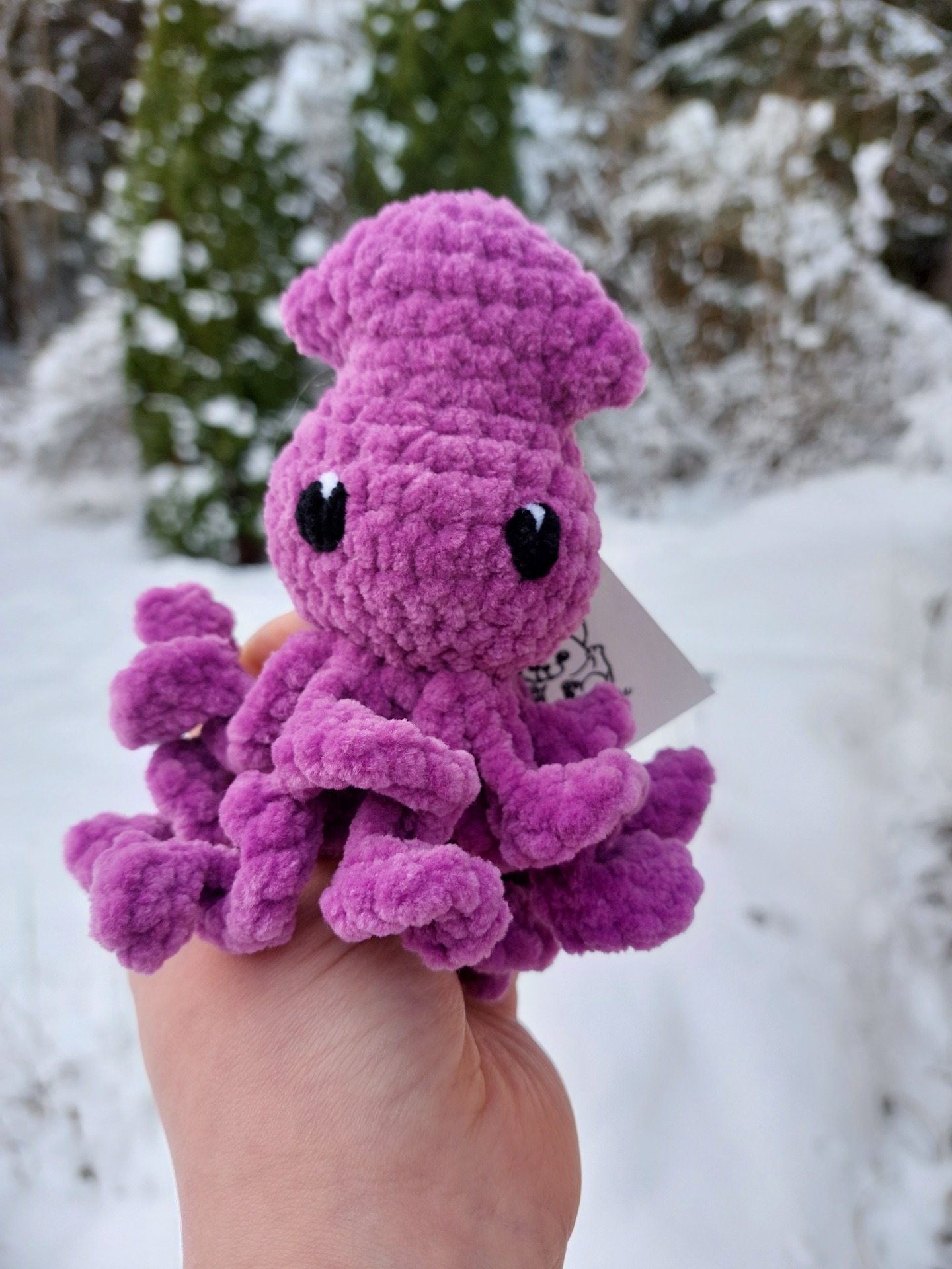 Purppuran värinen kalmari pehmolelu. Langalla on Oeko-tex sertifikaatti ja täytevanu soveltuu myös allergikoille. Kalmarilla on myös turvalliset lankasilmät joten se sopii hyvin myös vauvoille.