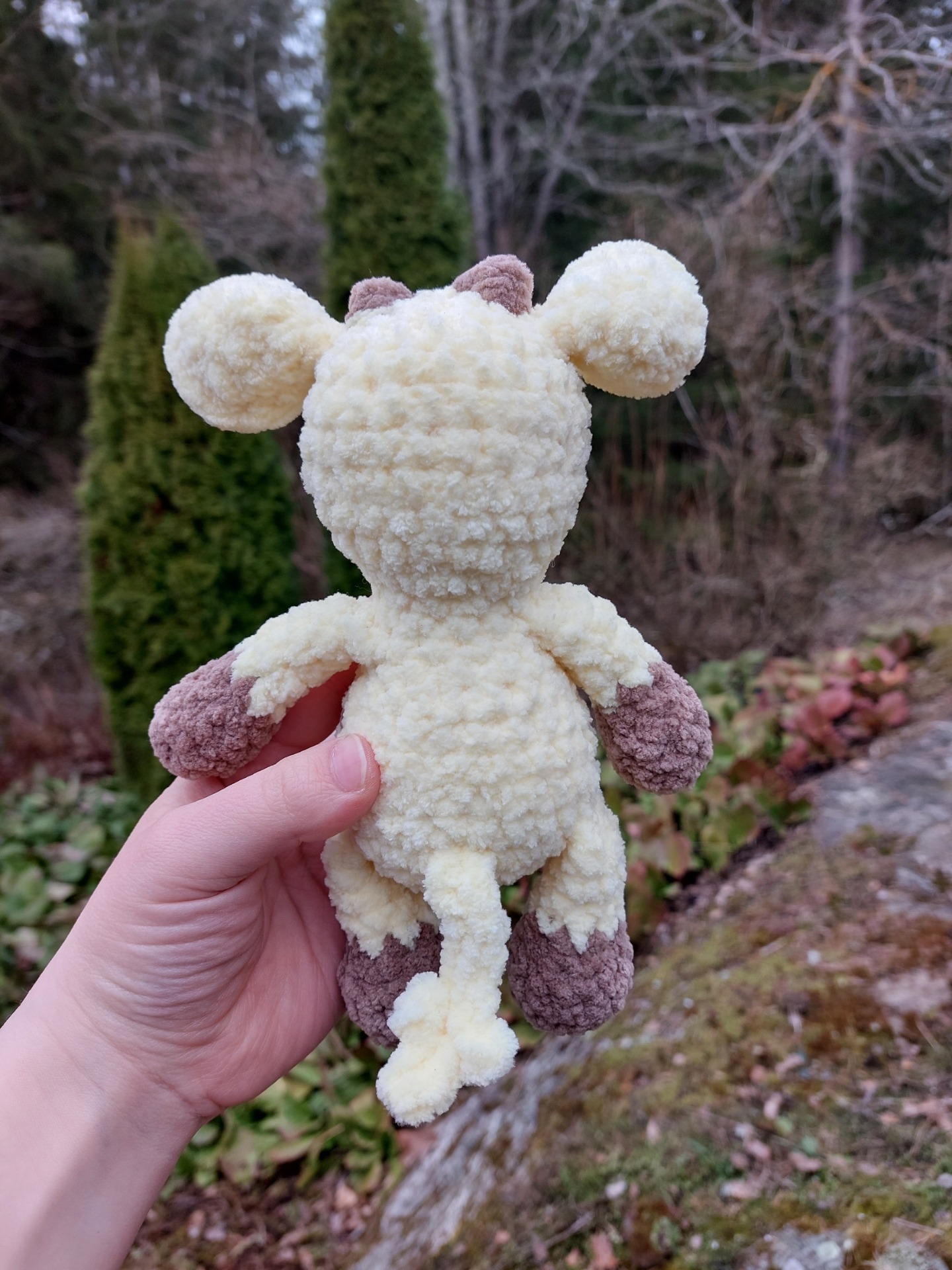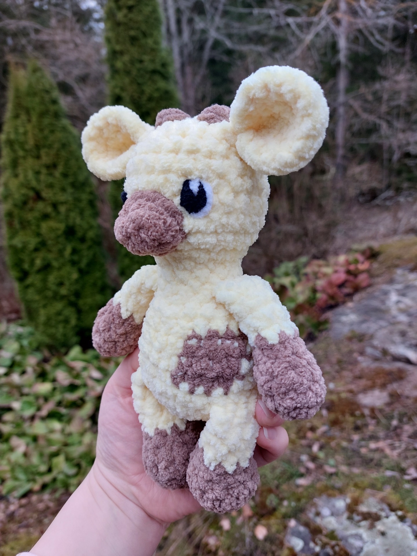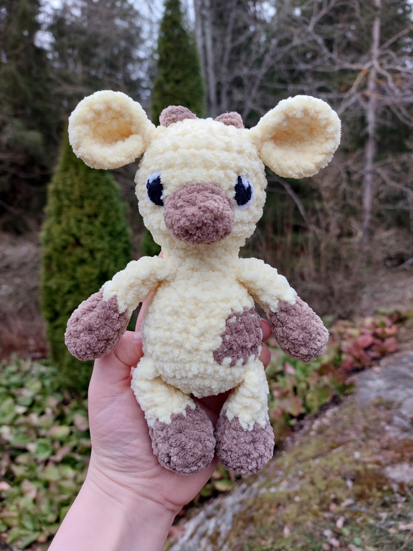 Vaaleankeltainen kirahvi pehmolelu ruskeilla yksityiskohdilla. Tällä kirahvilla on vauvaturvalliset lankasilmät.Langalla Oeko-tex sertifikaatti ja täytevanu soveltuu myös allergikoille.