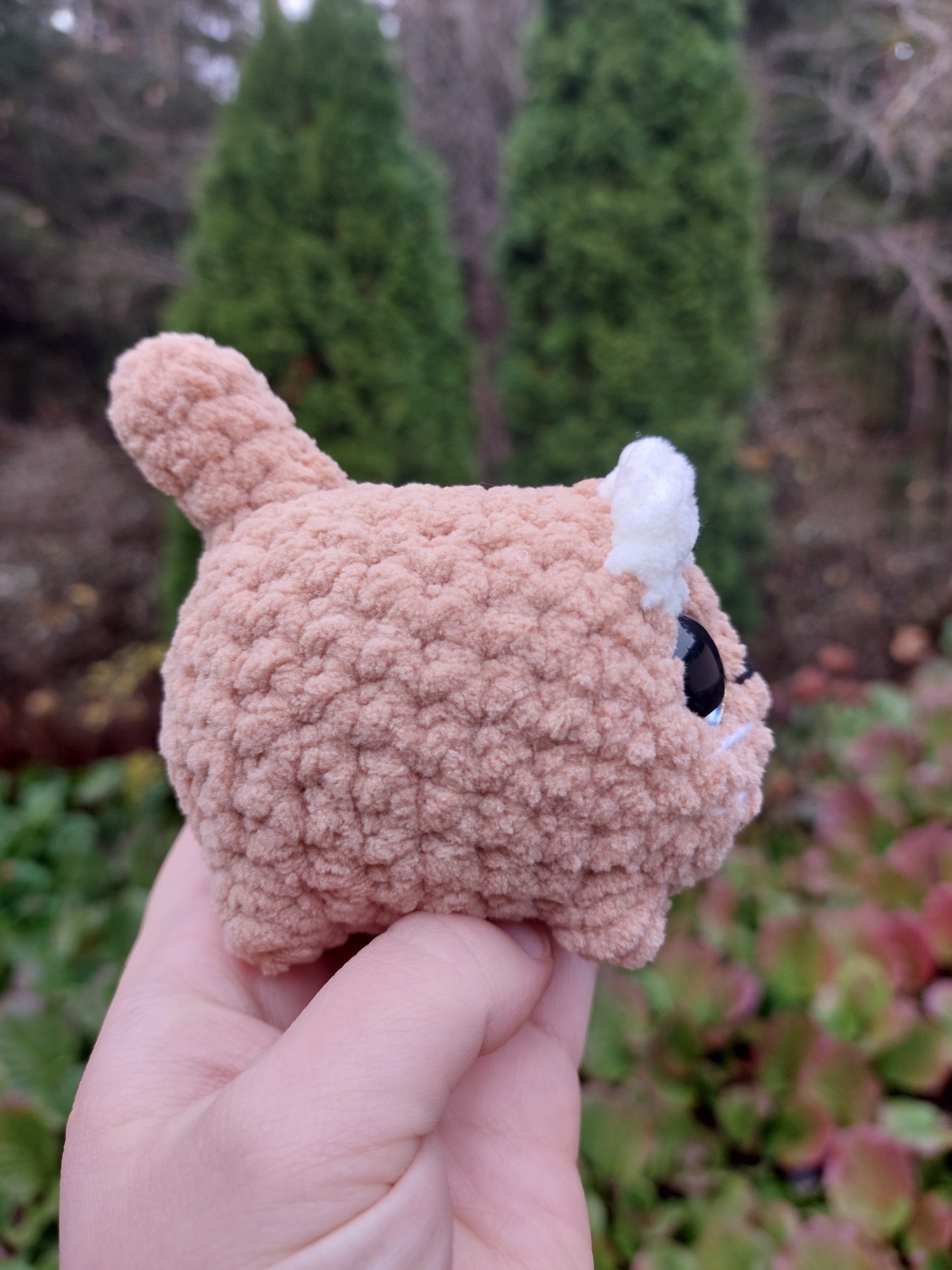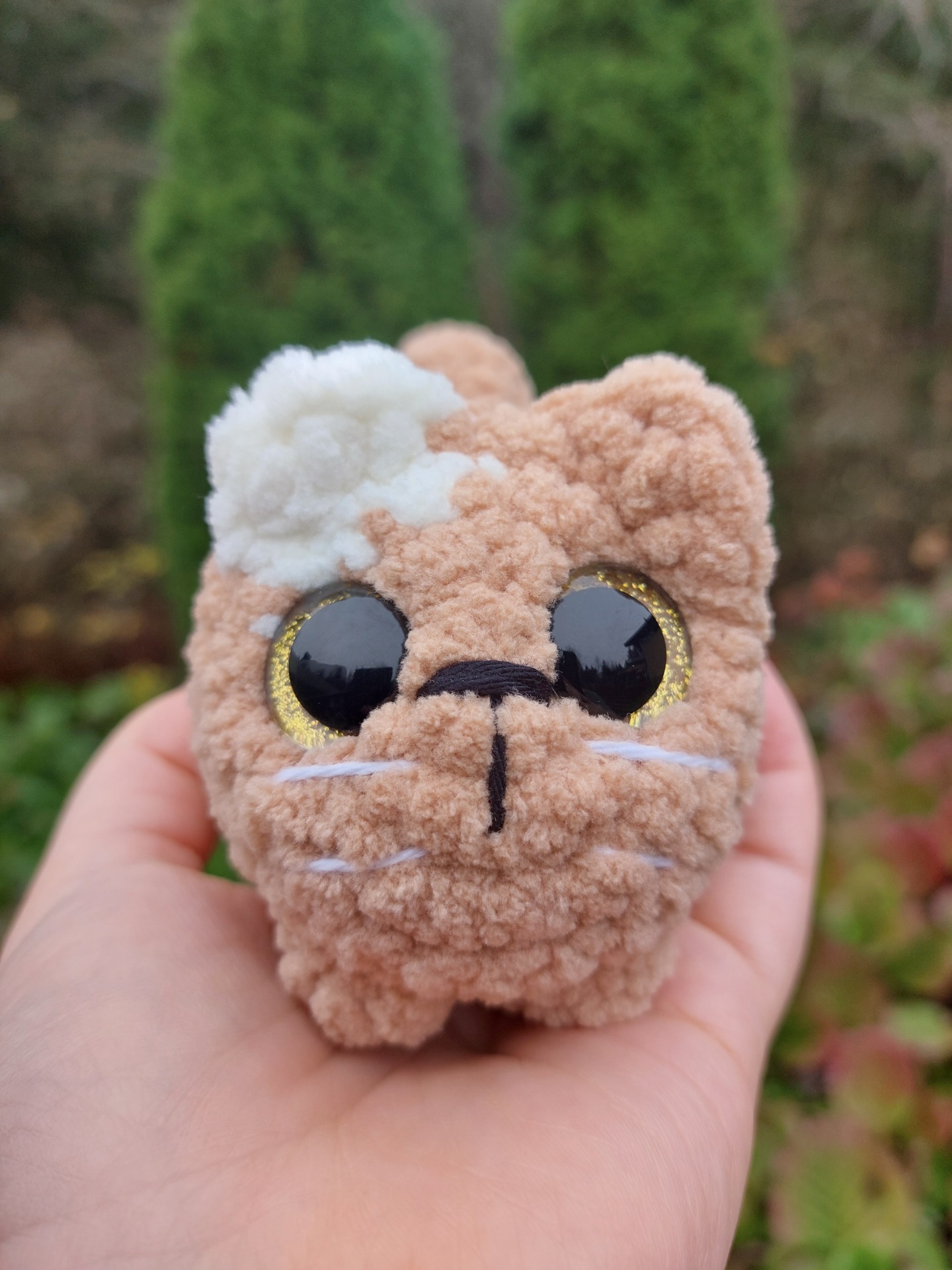 Toffeen sävyinen kissa pehmolelu isoilla kimaltavilla kullan värisillä glitter silmillä. Langalla Oeko-tex sertifikaatti ja täytevanu soveltuu myös allergikoille.