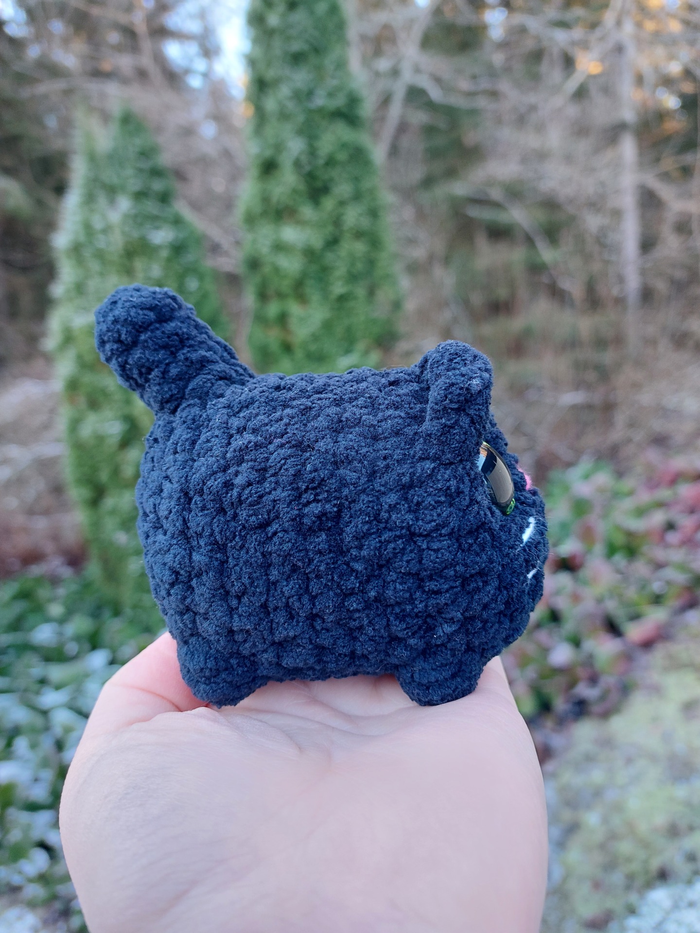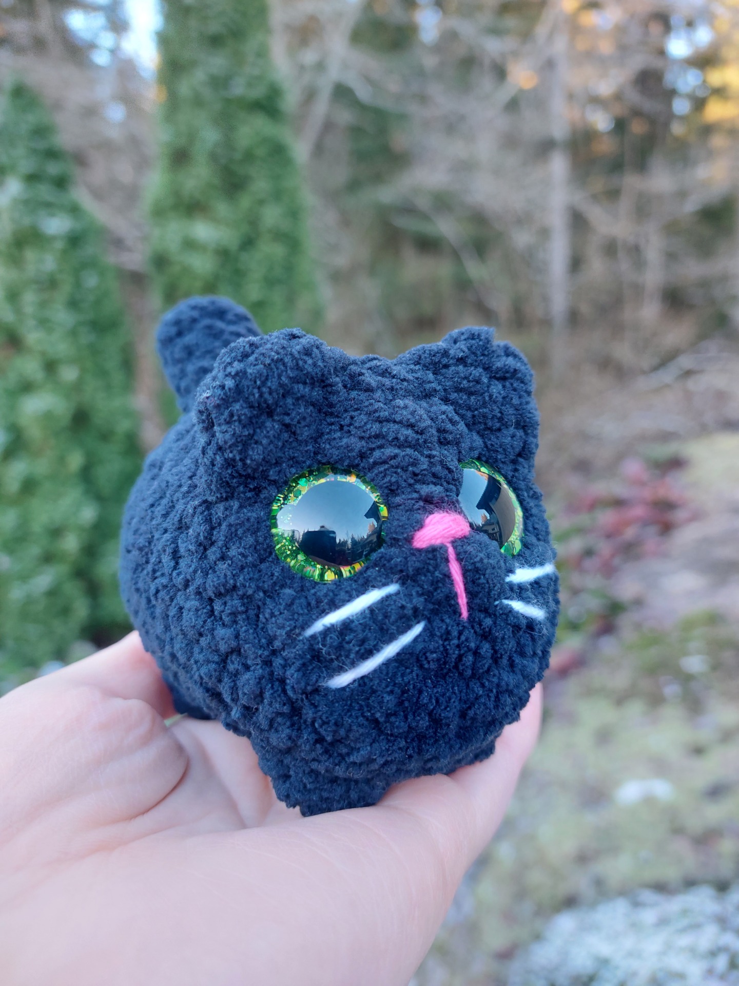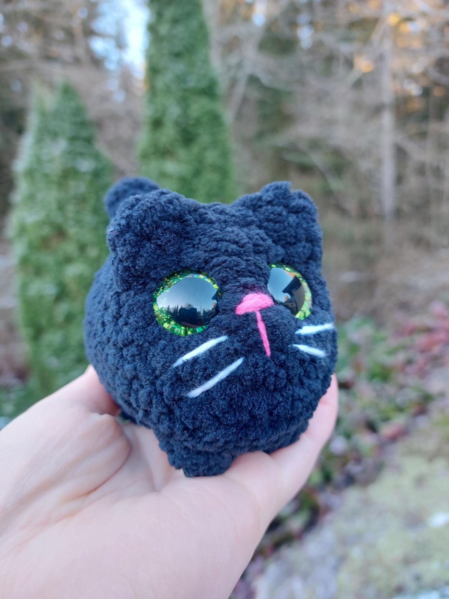 Musta kissa pehmolelu isoilla kimaltavilla vihreillä glitter silmillä. Langalla Oeko-tex sertifikaatti ja täytevanu soveltuu myös allergikoille.