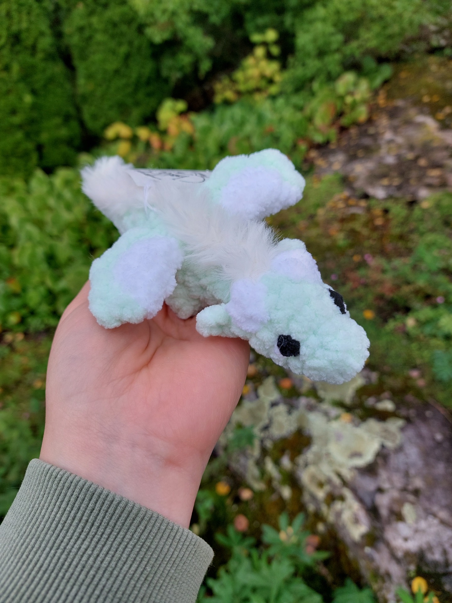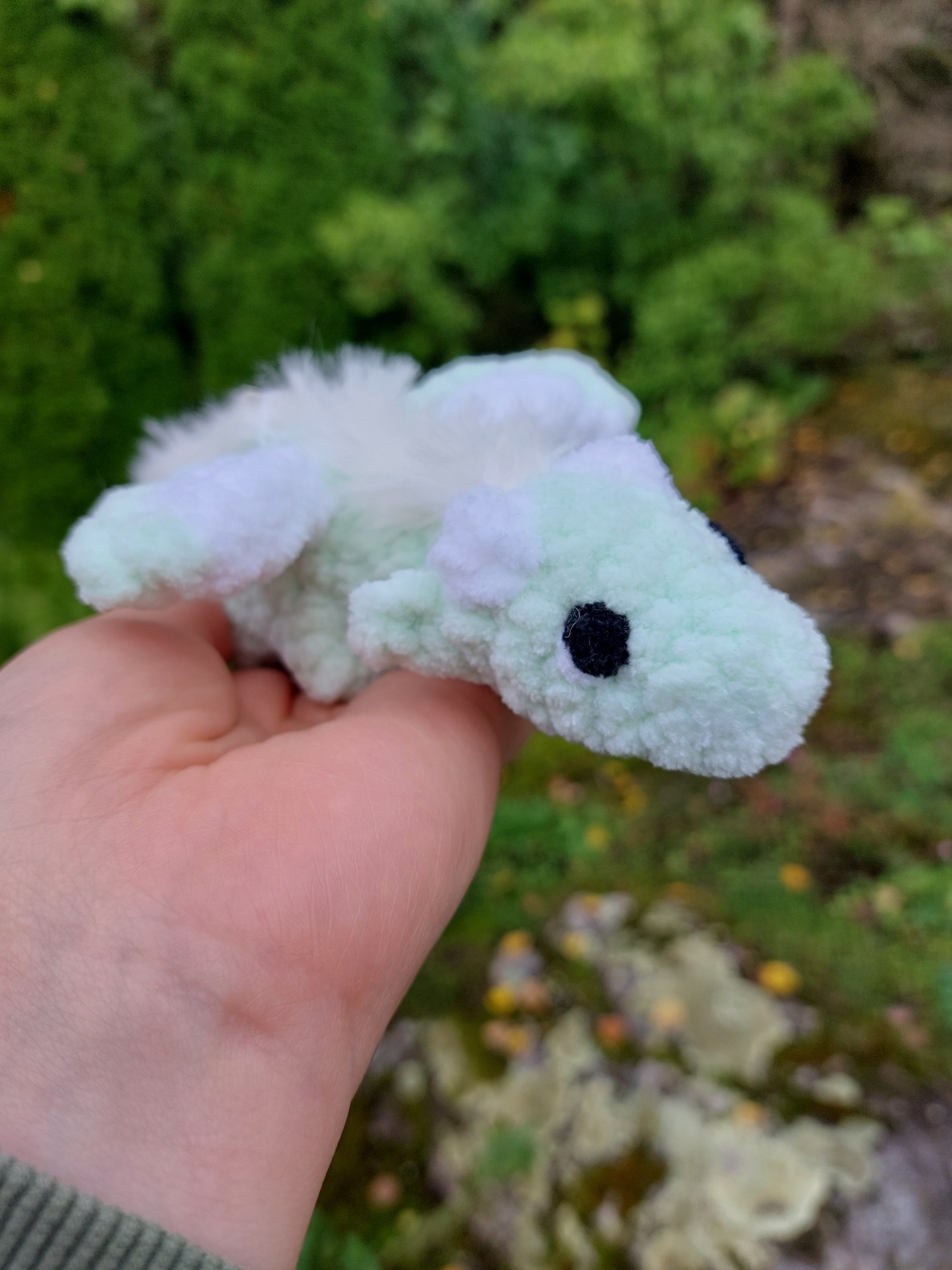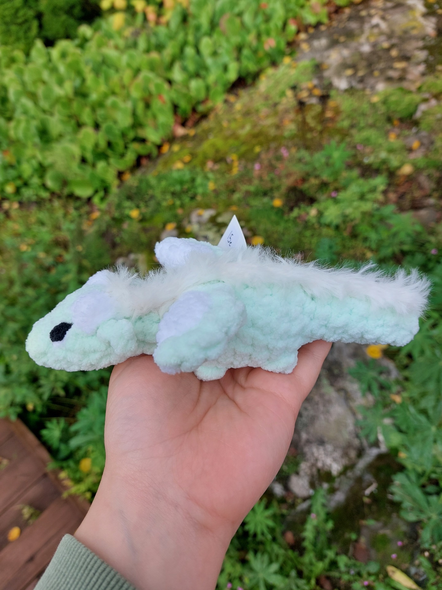 Mintun värinen pehmeä lohikäärme pehmolelu turvallisilla lankasilmillä.