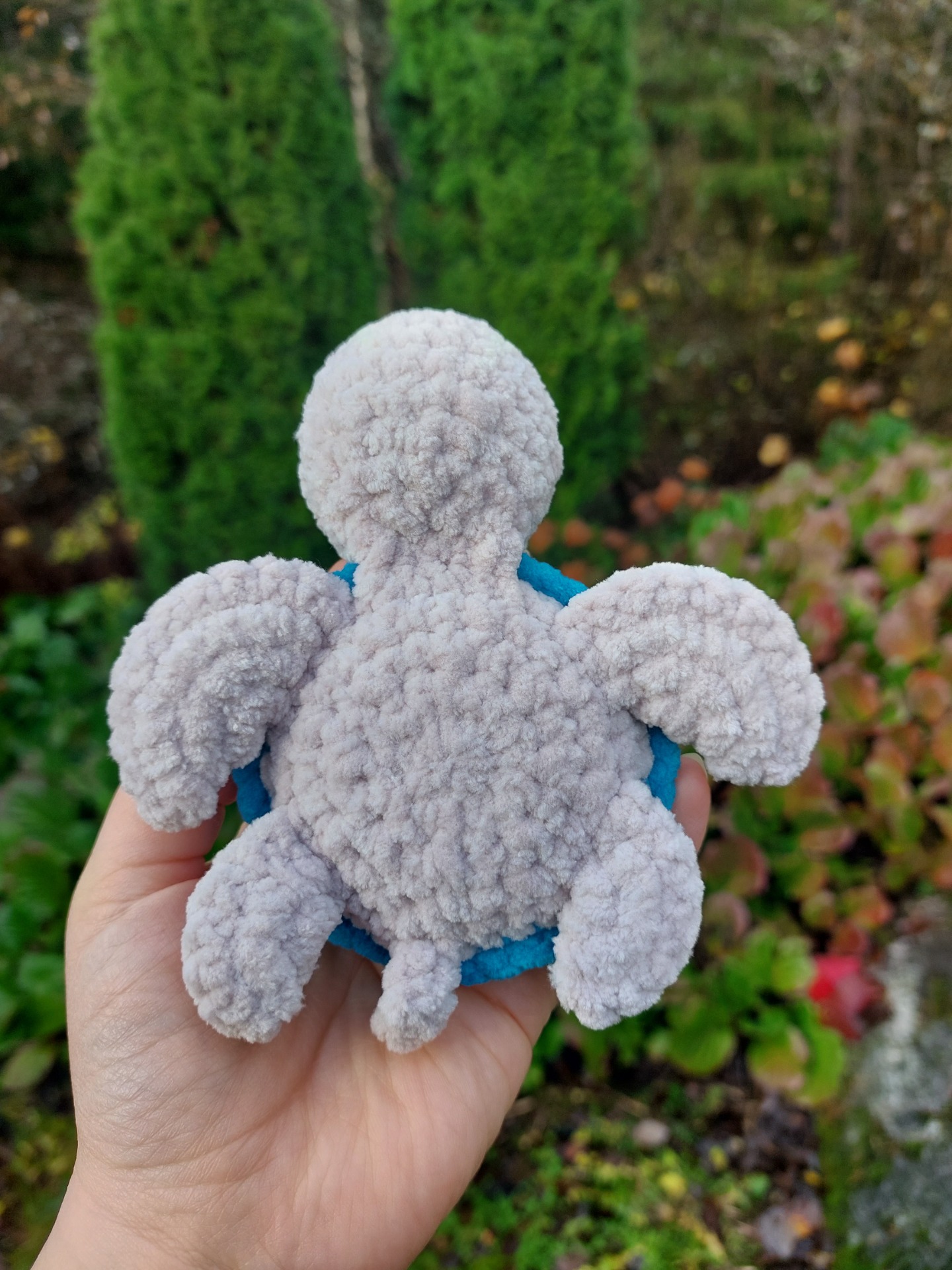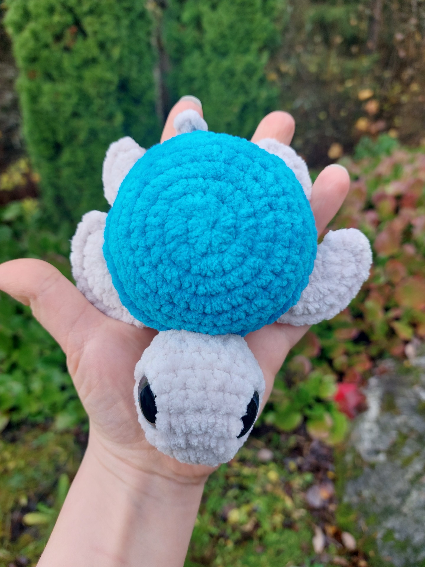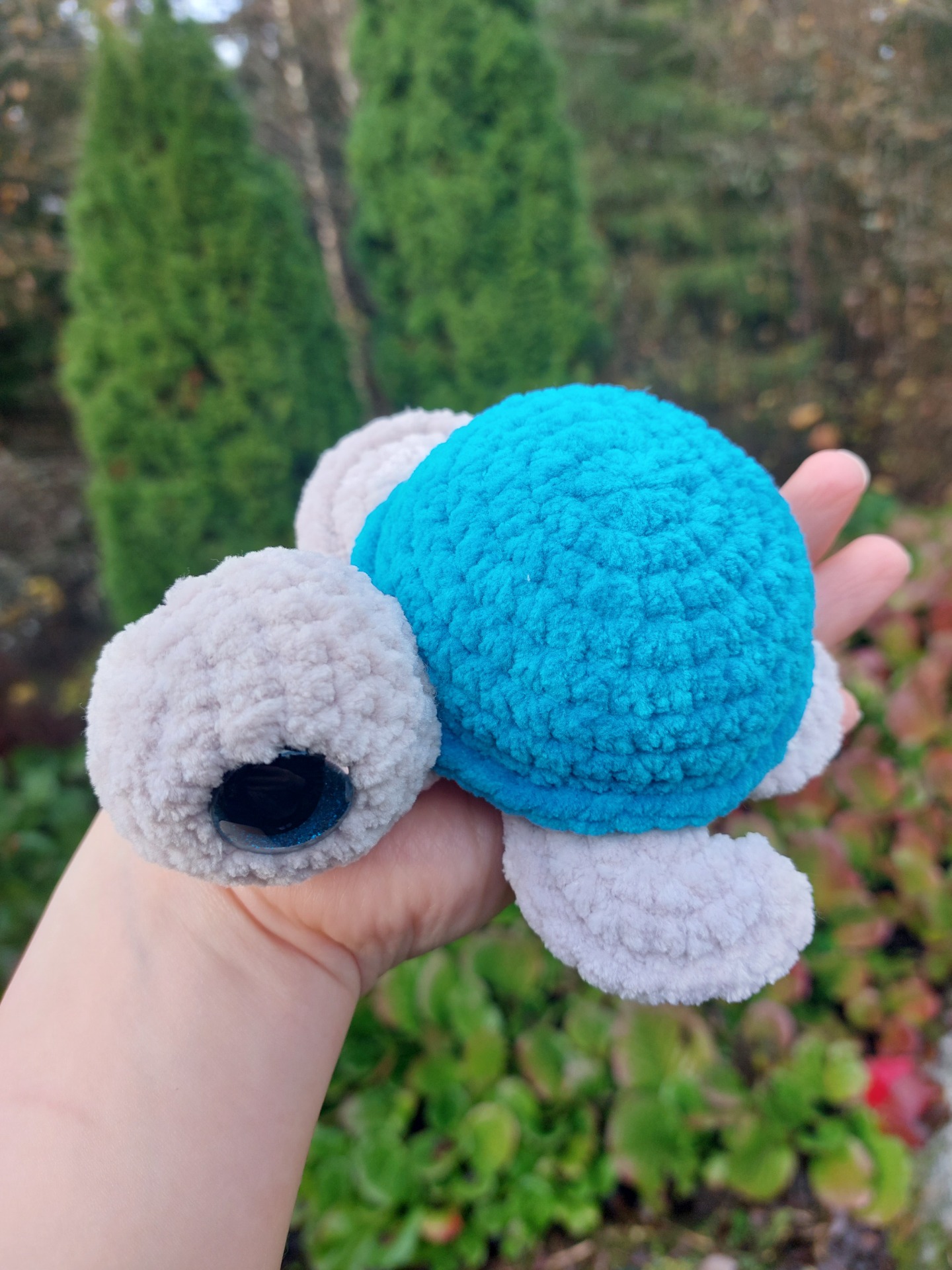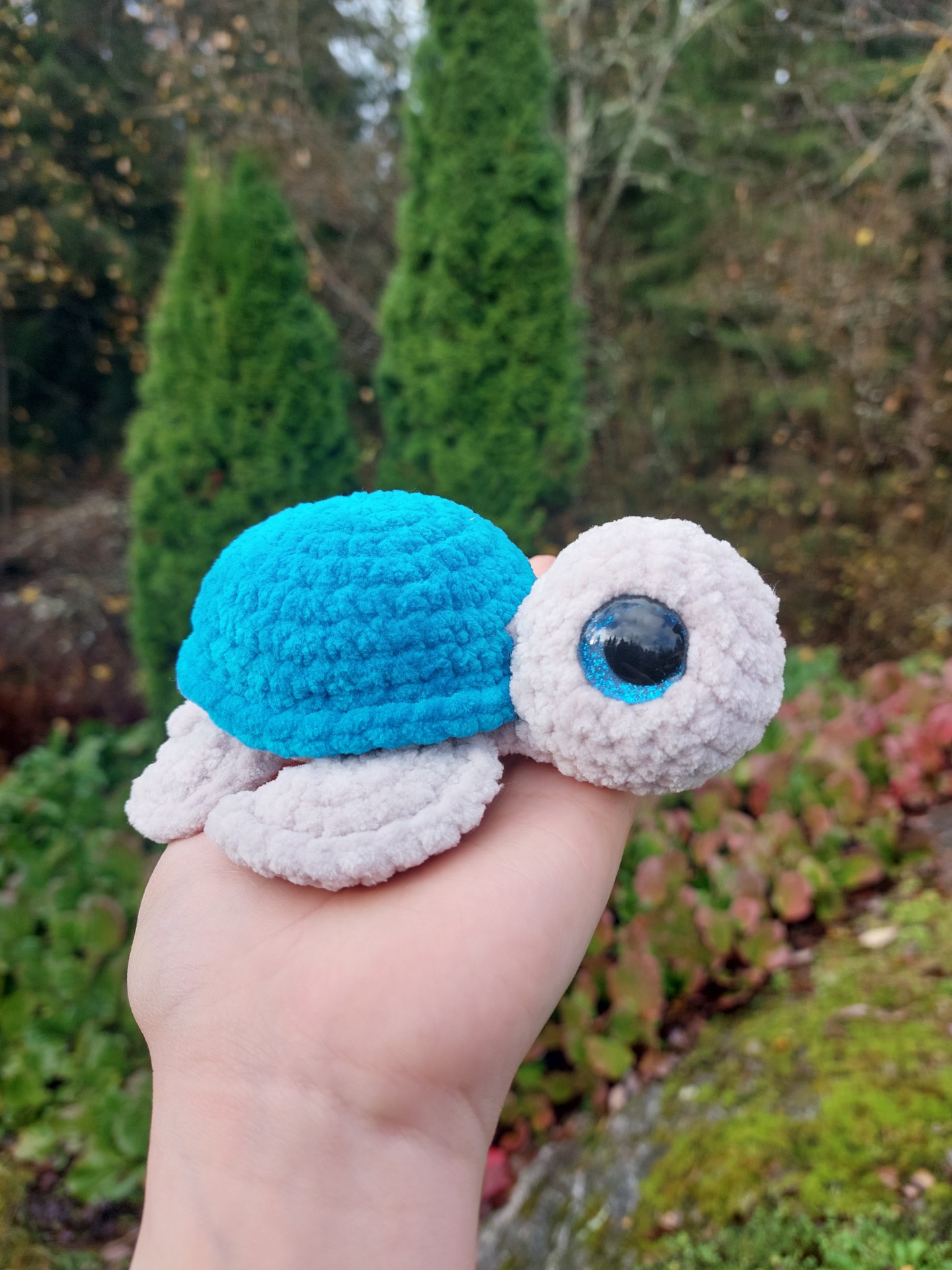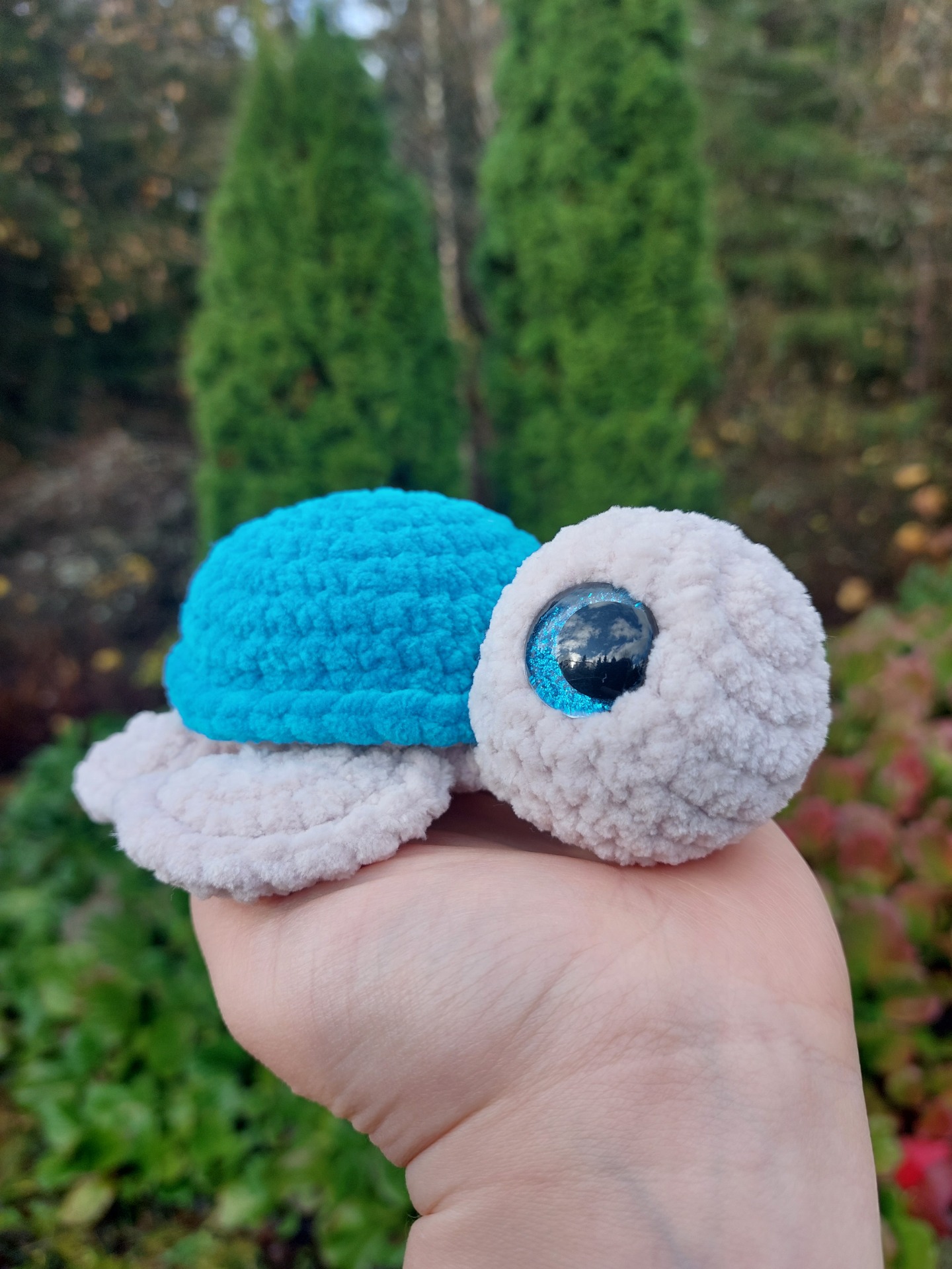 Merikilpikonna turkoosin värisellä kilvellä ja kimaltavilla glitter-silmillä. Langalla on Oeko-tex sertifikaatti ja täytevanu soveltuu myös allergikoille.