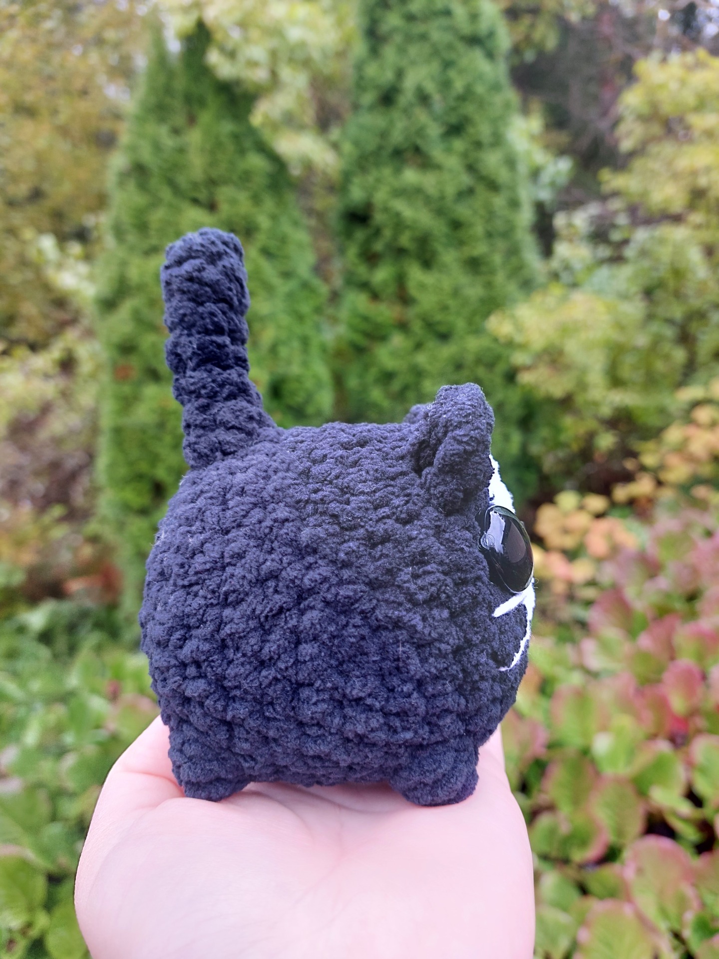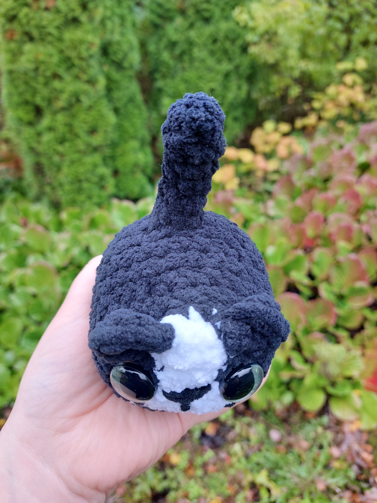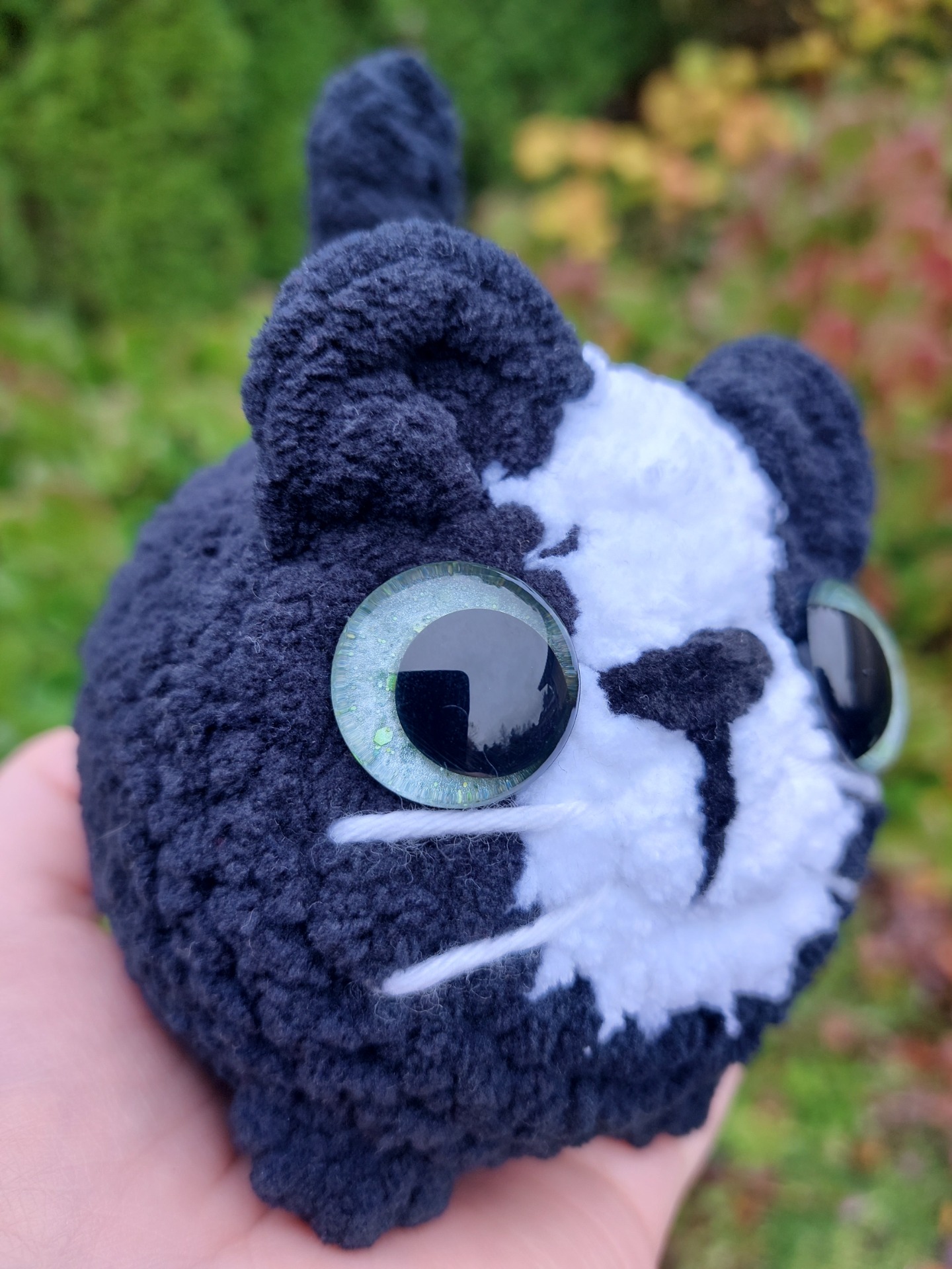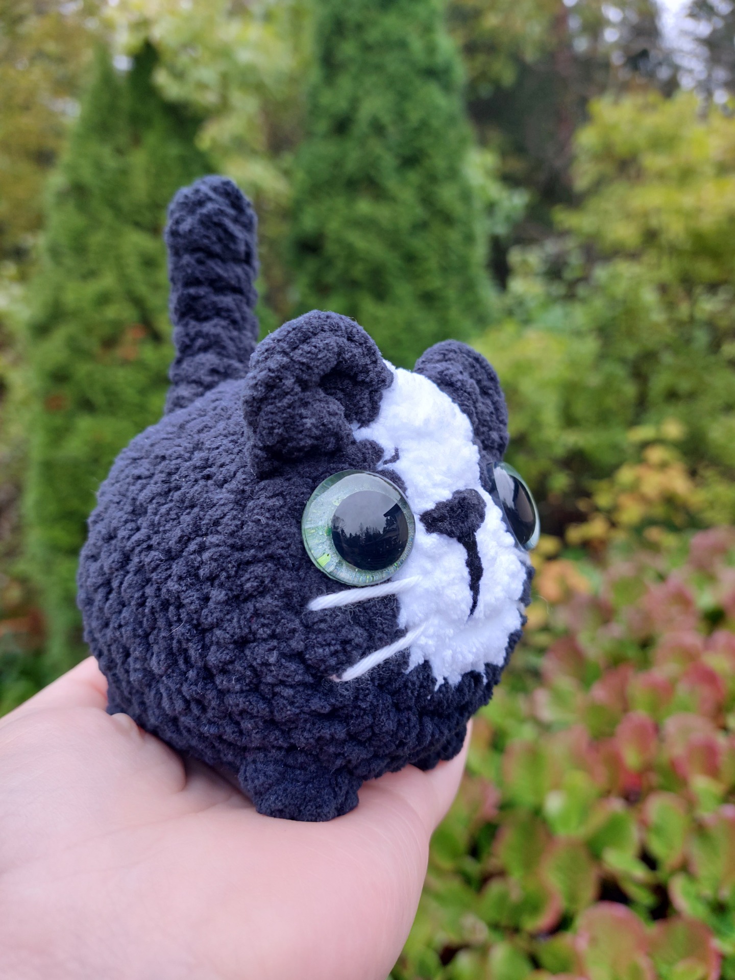 Mustavalkoinen kissa pehmolelu isoilla kimaltavilla vaaleanvihreillä glitter silmillä. Langalla Oeko-tex sertifikaatti ja täytevanu soveltuu myös allergikoille.