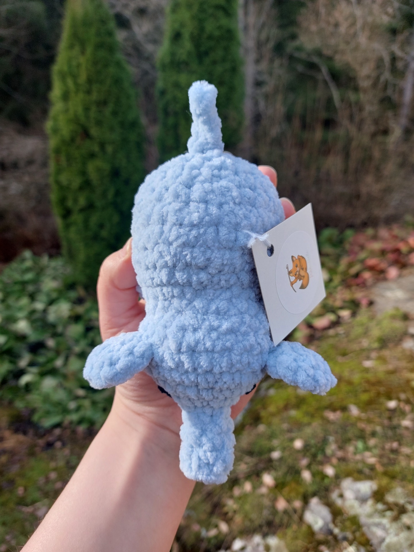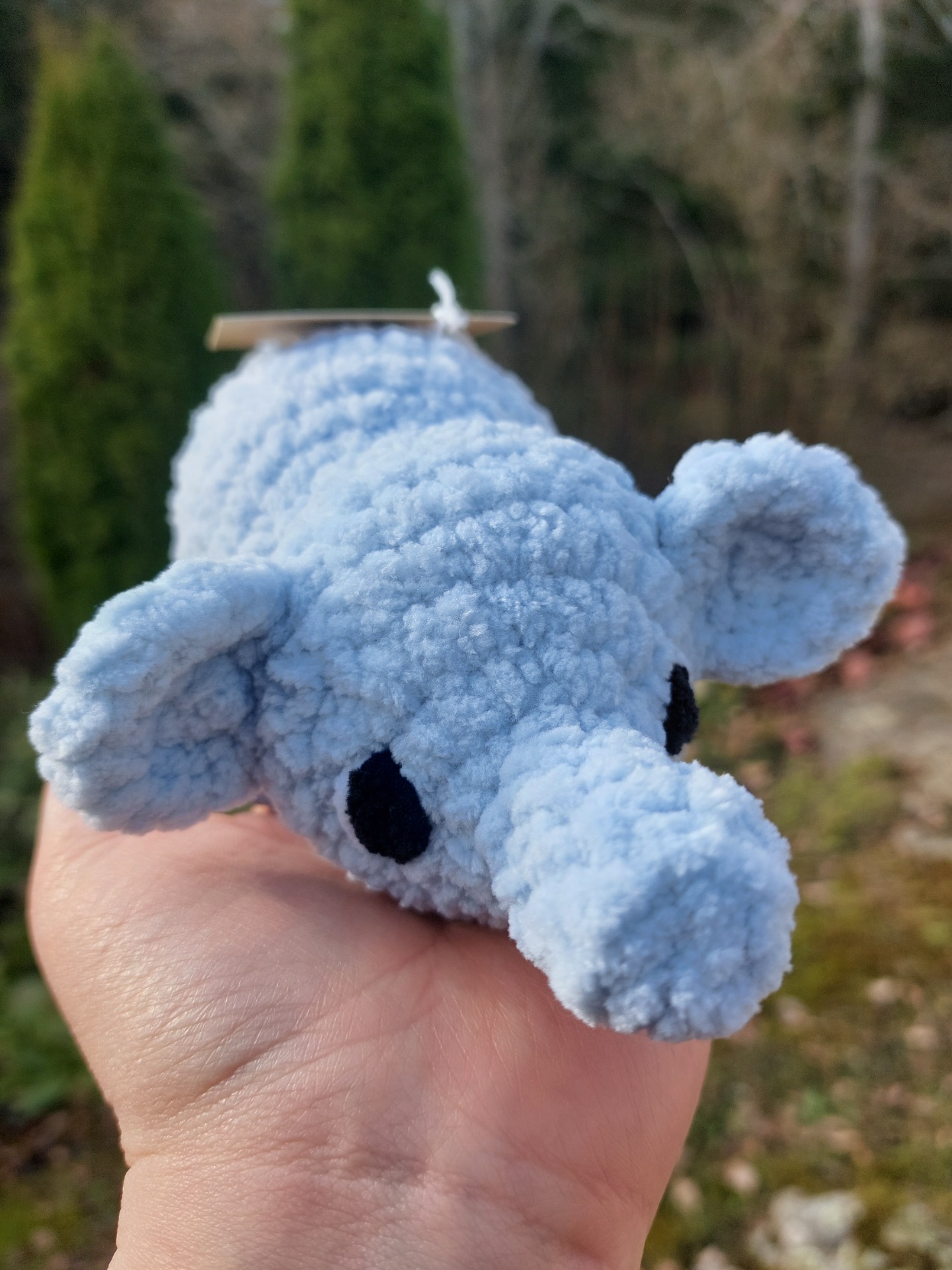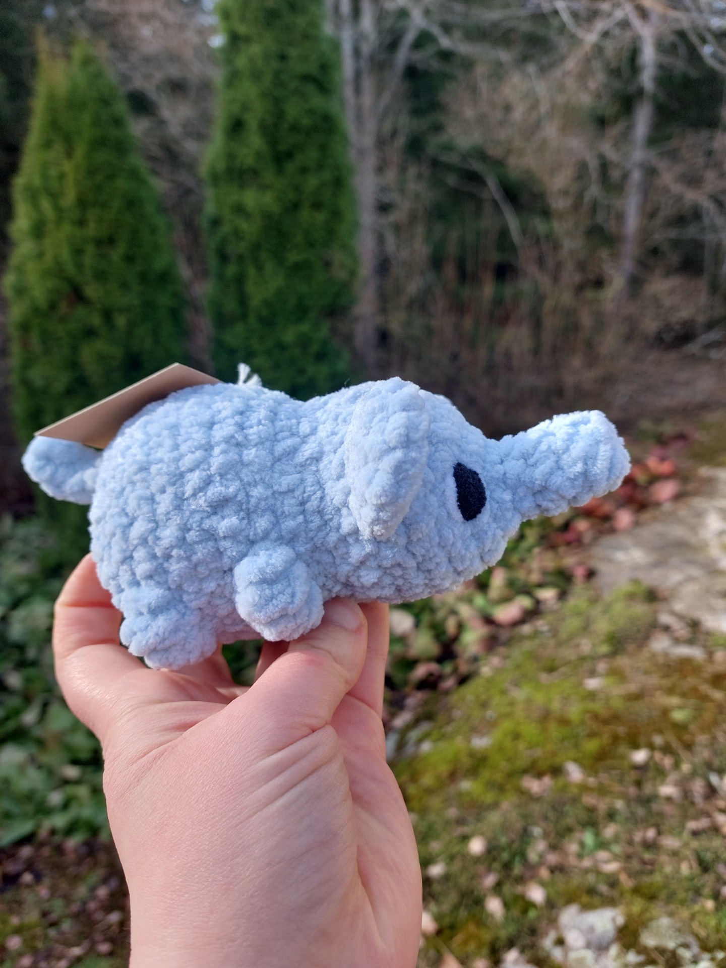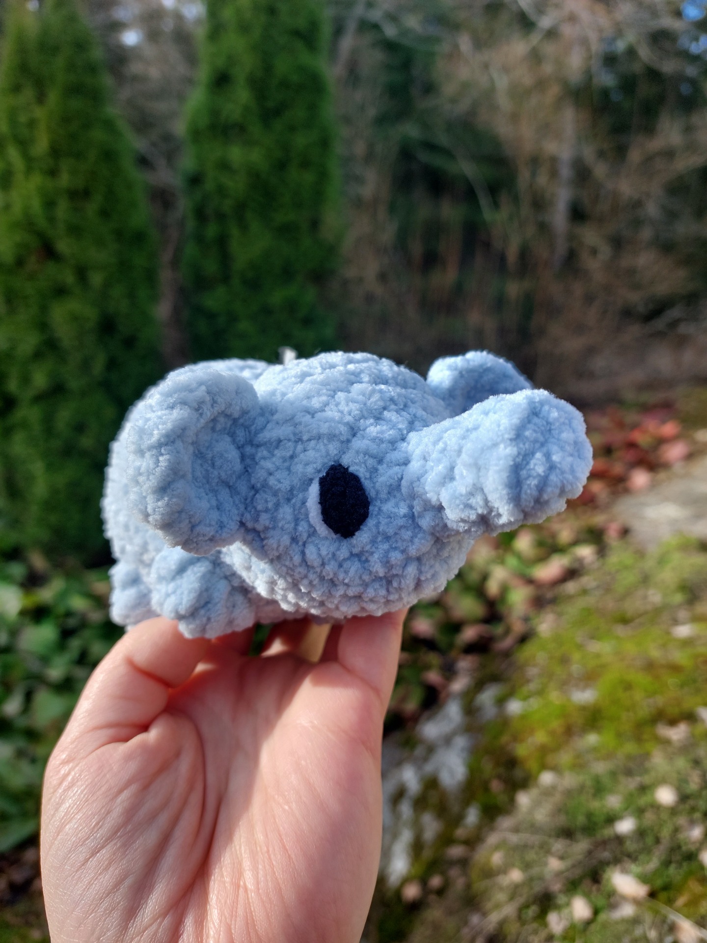 Harmaan sininen norsu pehmolelu vauvoille turvallisilla lankasilmillä. Langalla on Oeko-tex sertifikaatti ja täytevanu soveltuu myös allergikoille.