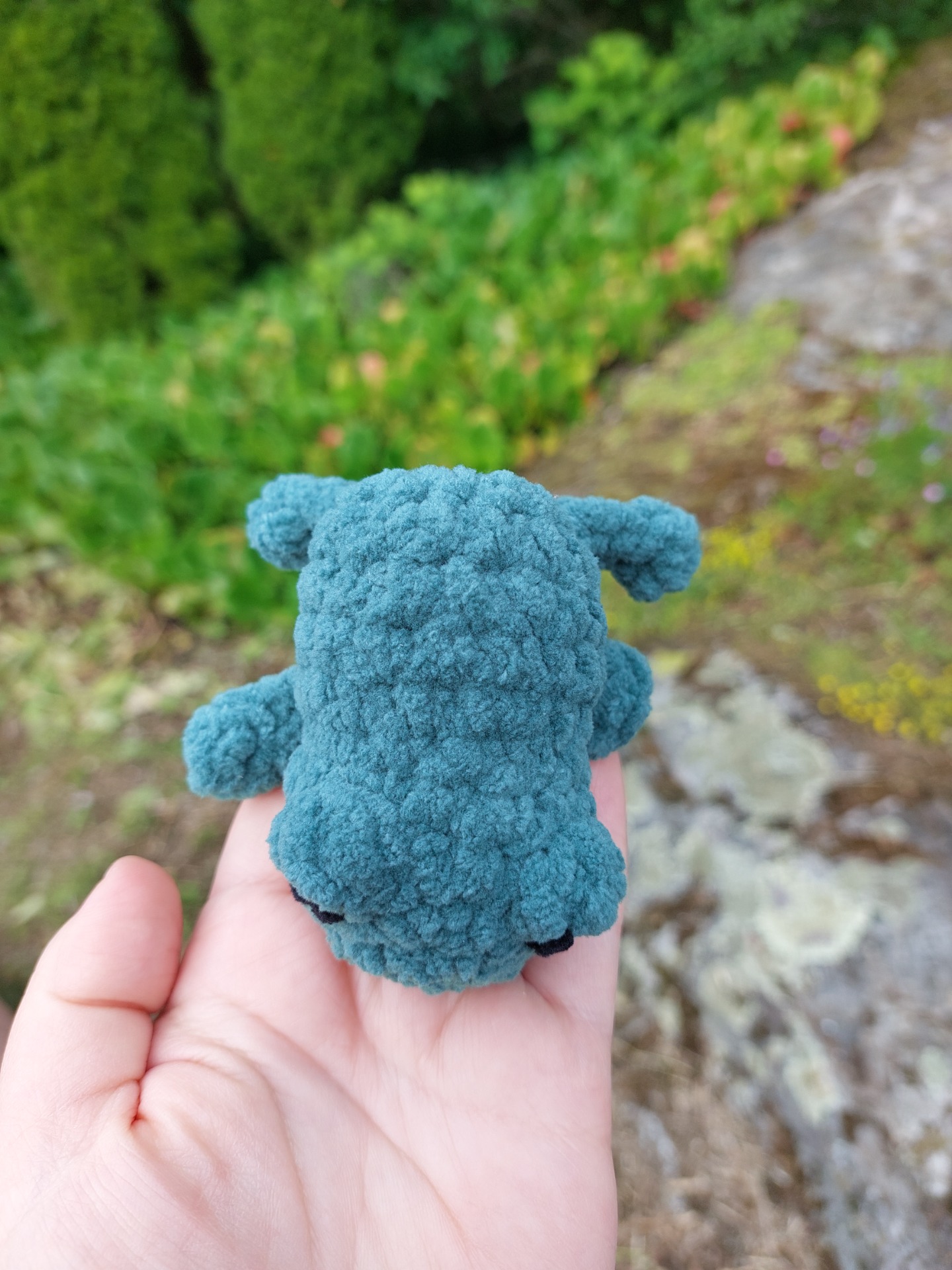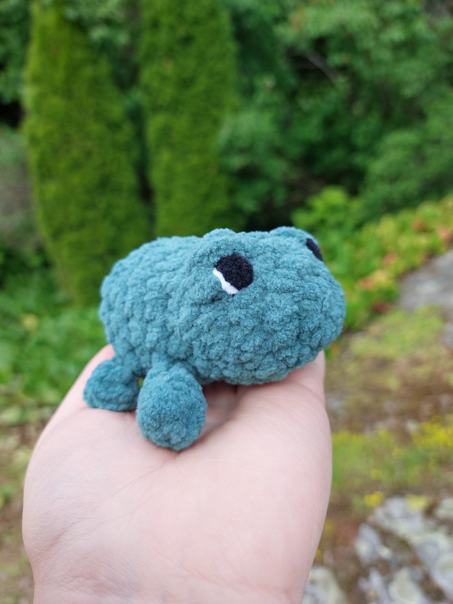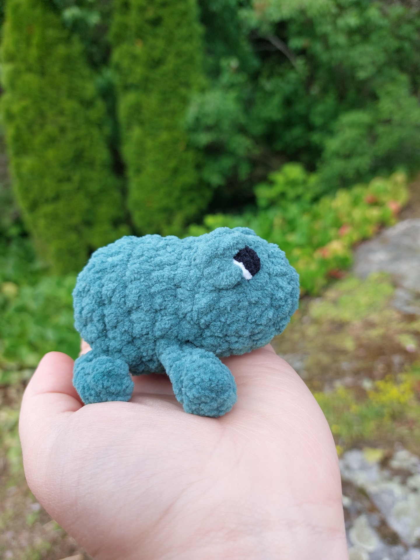 Vihreä sammakko pehmolelu turvallisilla lankasilmillä.