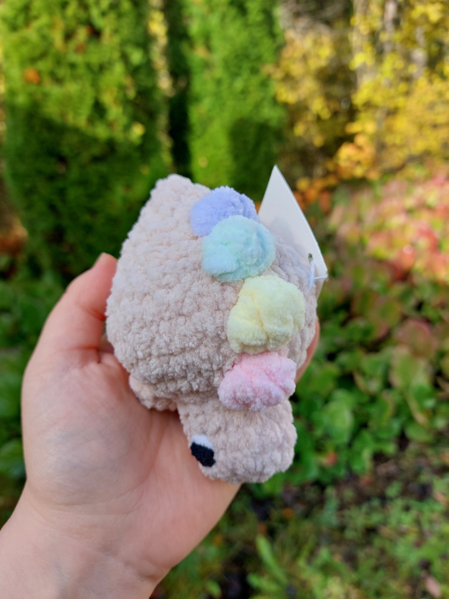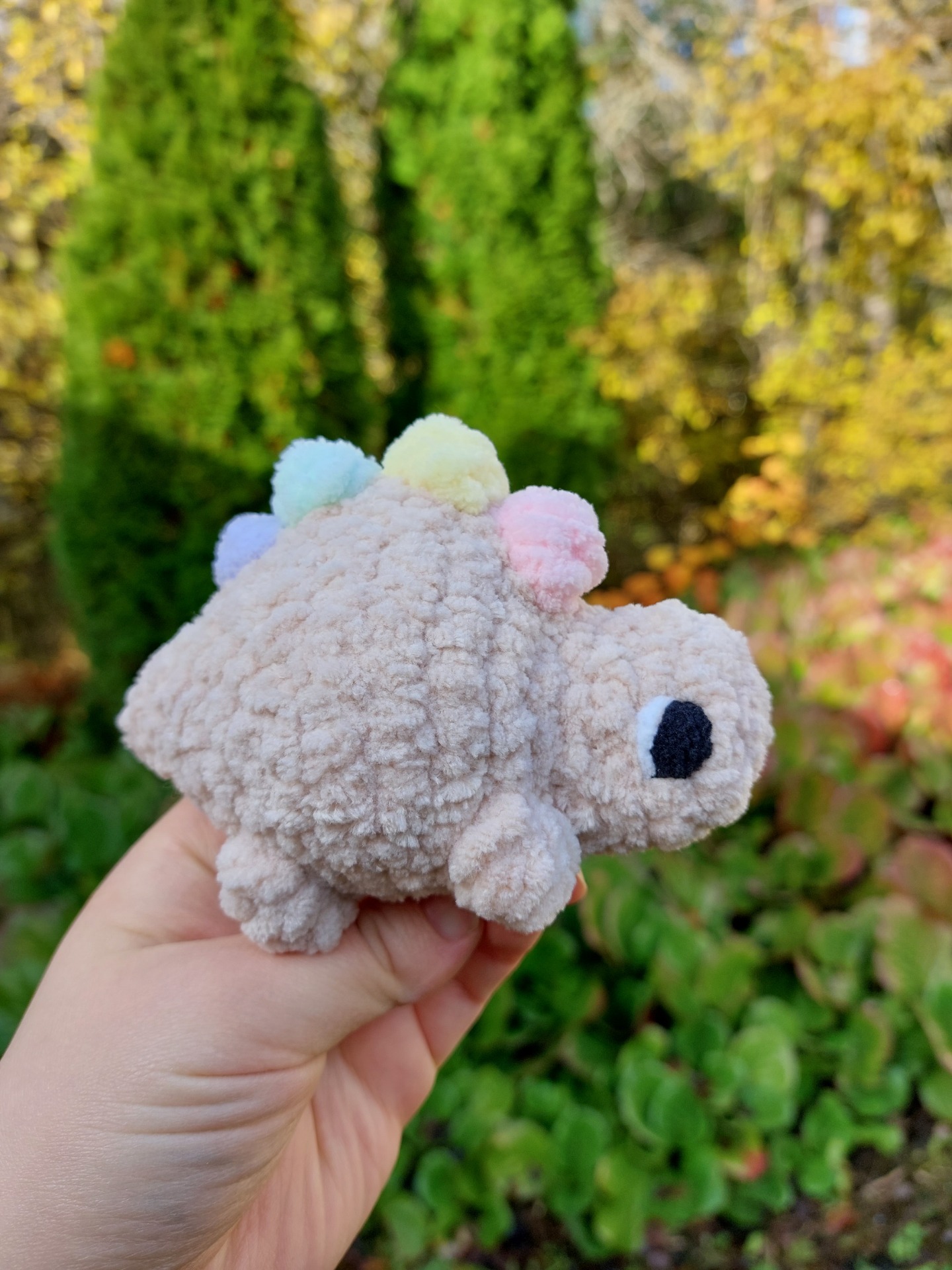 Ihanan pehmeä dinosaurus pastellin värisillä piikeillä. Langalla on Oeko-tex sertifikaatti ja täytevanu soveltuu myös allergikoille.