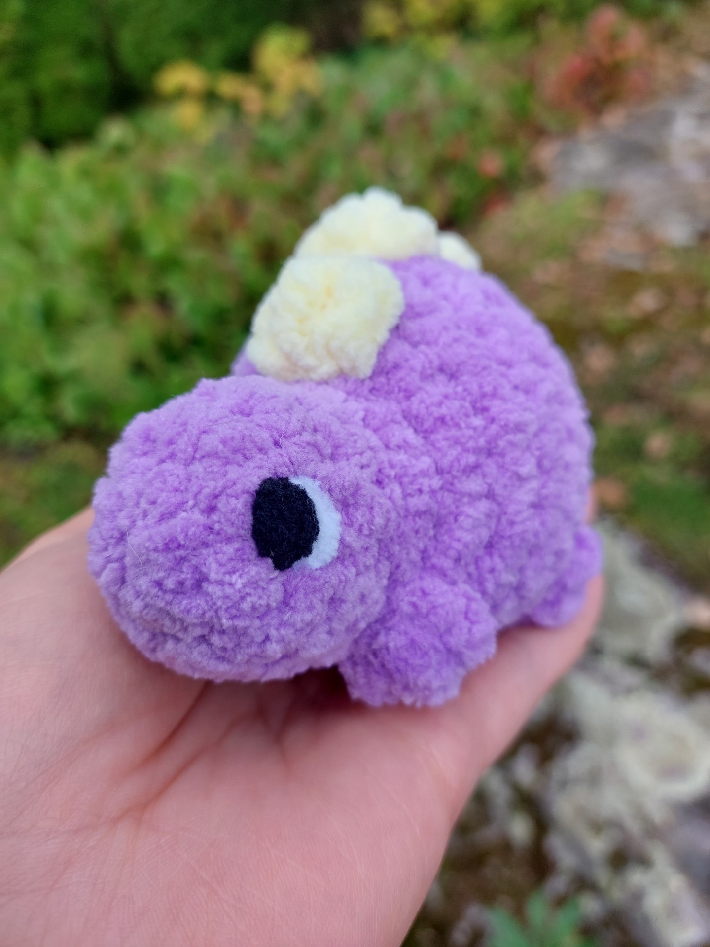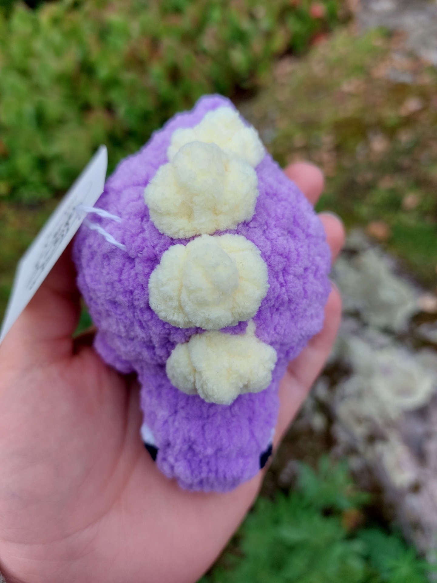 Ihanan pehmeä liila dinosaurus keltaisen värisillä piikeillä. Langalla on Oeko-tex sertifikaatti ja täytevanu soveltuu myös allergikoille.