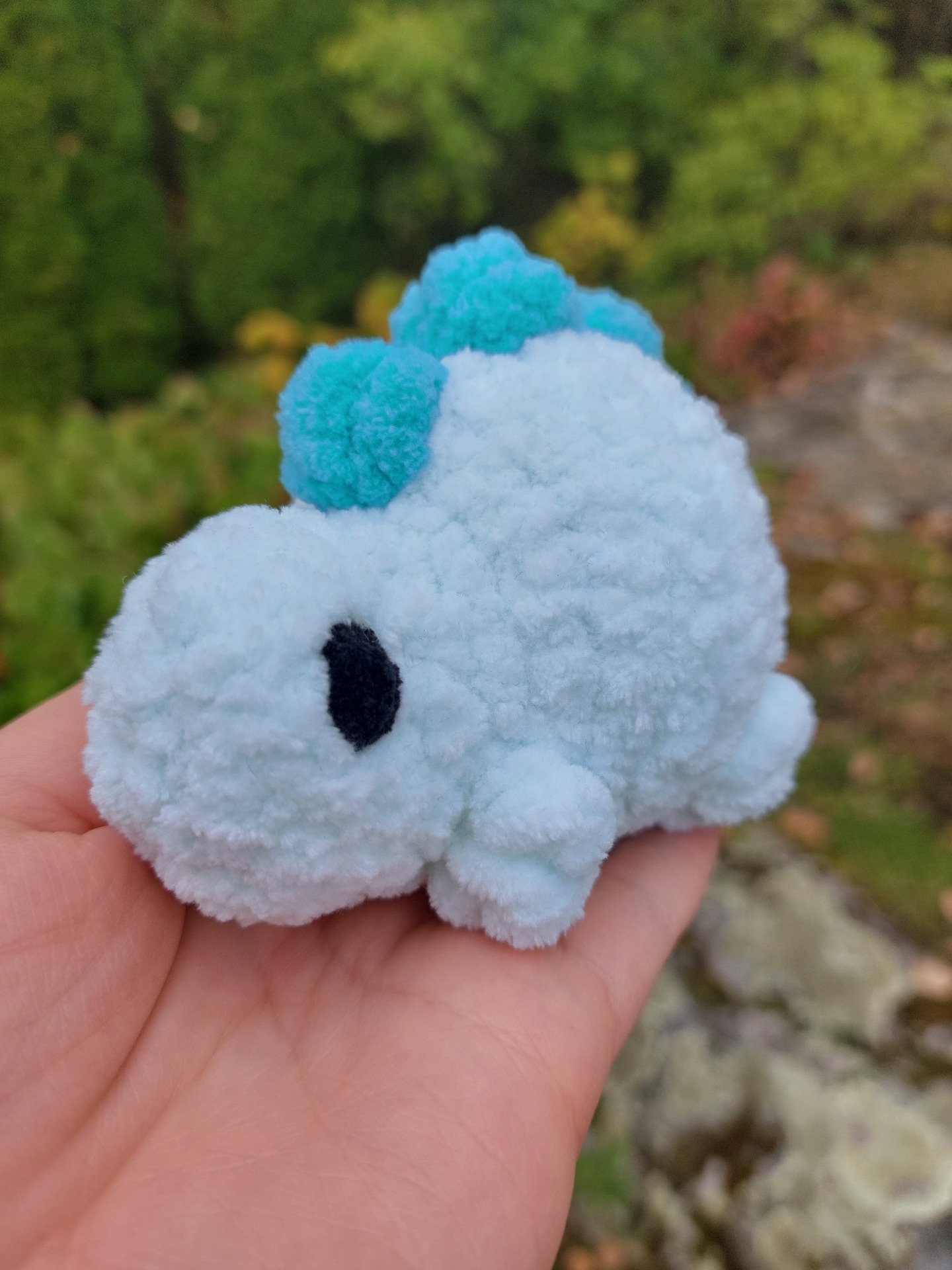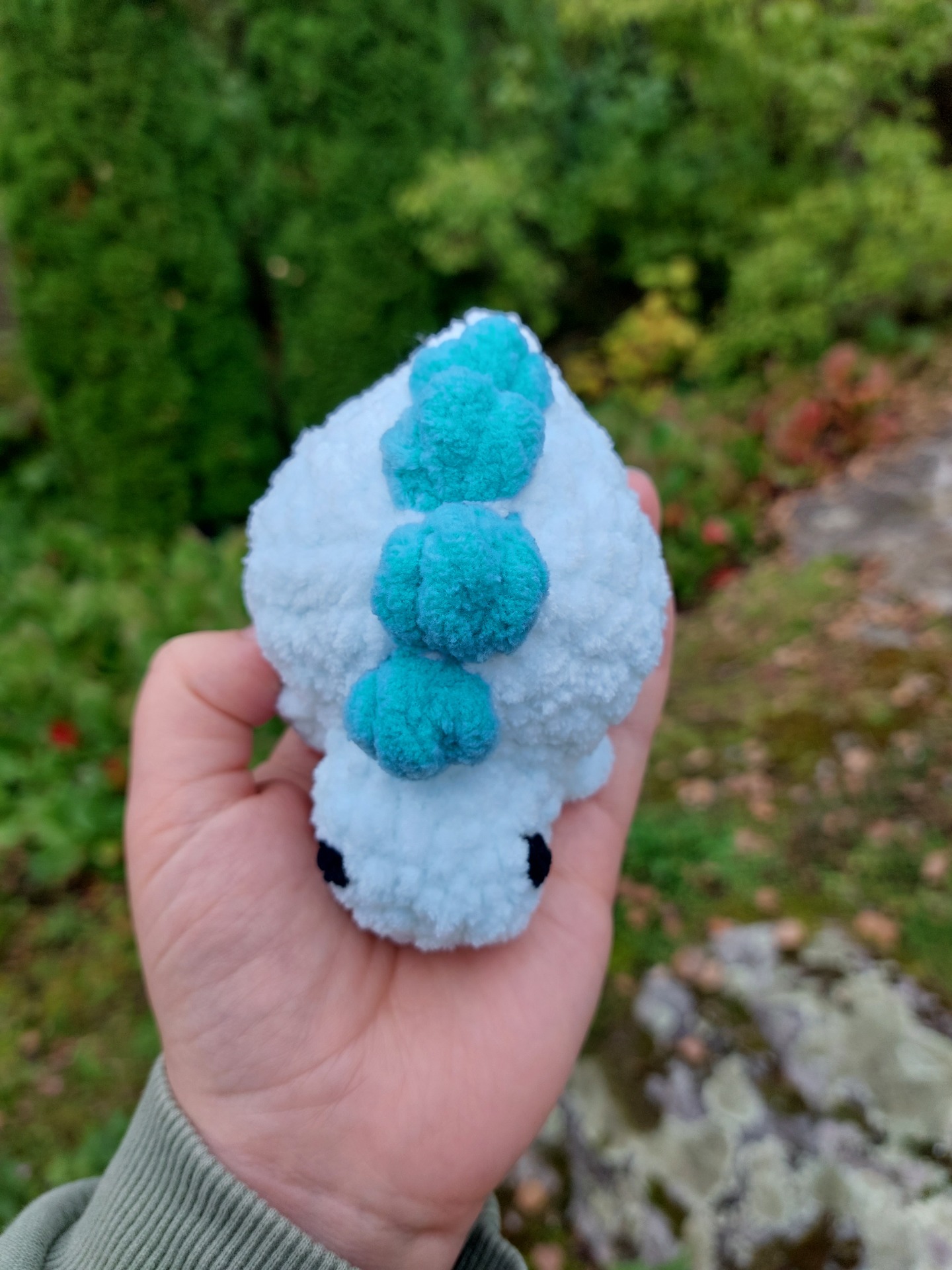 Ihanan pehmeä pastellin sininen dinosaurus turkoosin värisillä piikeillä. Langalla on Oeko-tex sertifikaatti ja täytevanu soveltuu myös allergikoille.