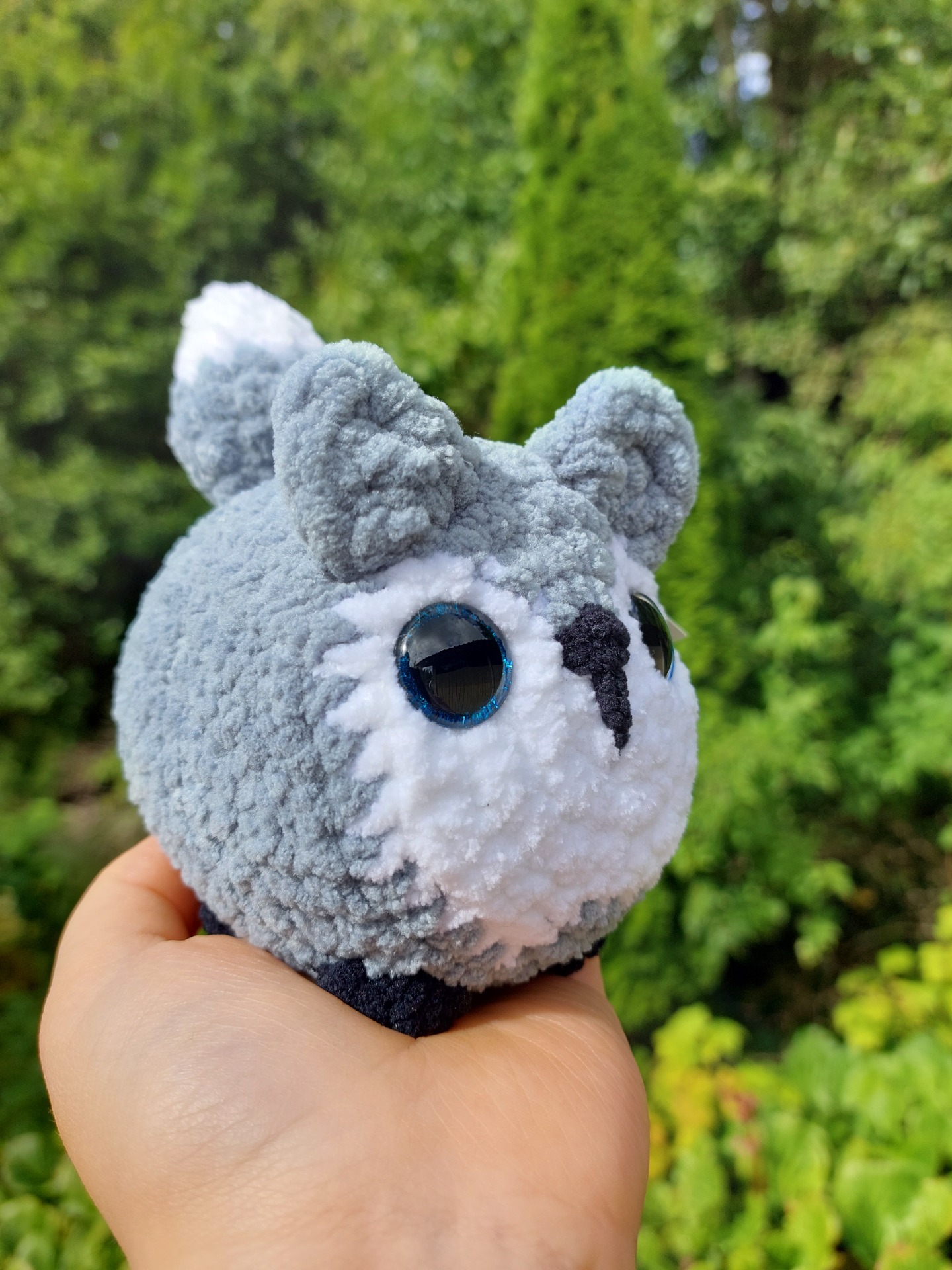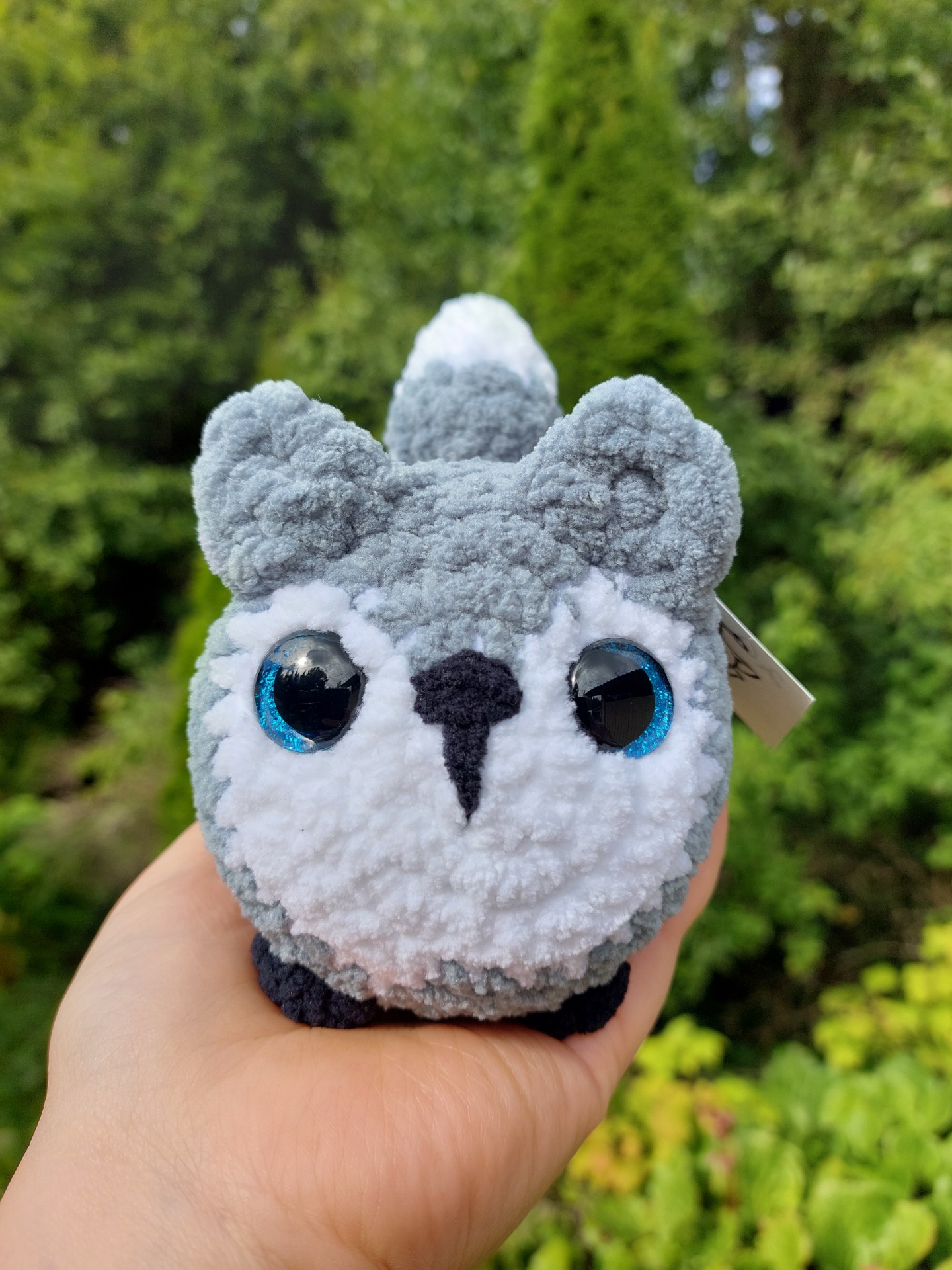 Pehmeä harmaa susi pehmolelu glitter silmillä. Langalla Oeko-tex sertifikaatti ja täytevanu soveltuu myös allergikoille.