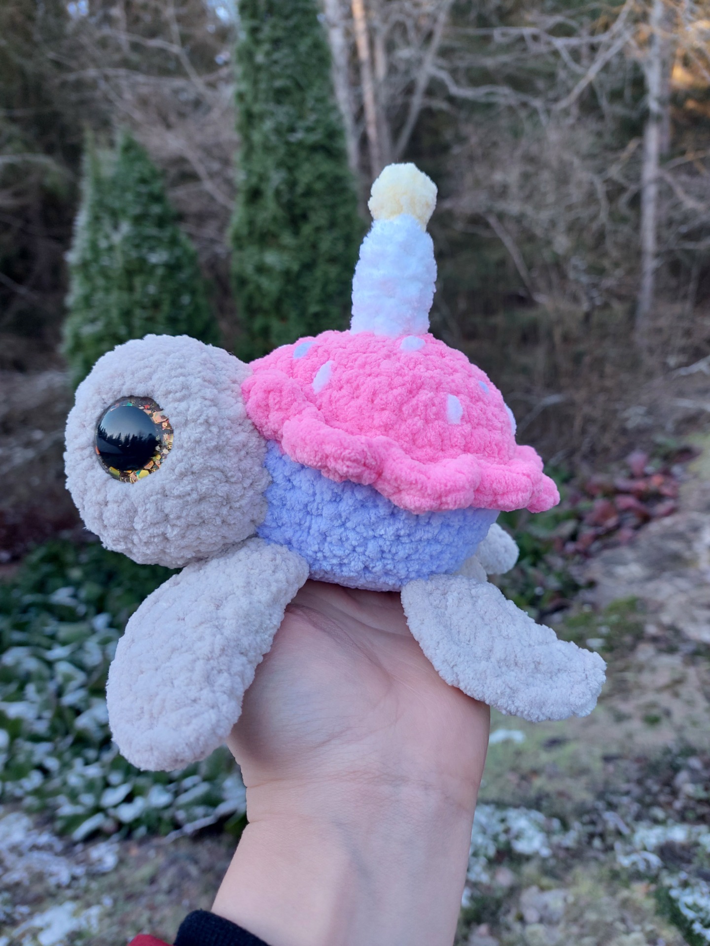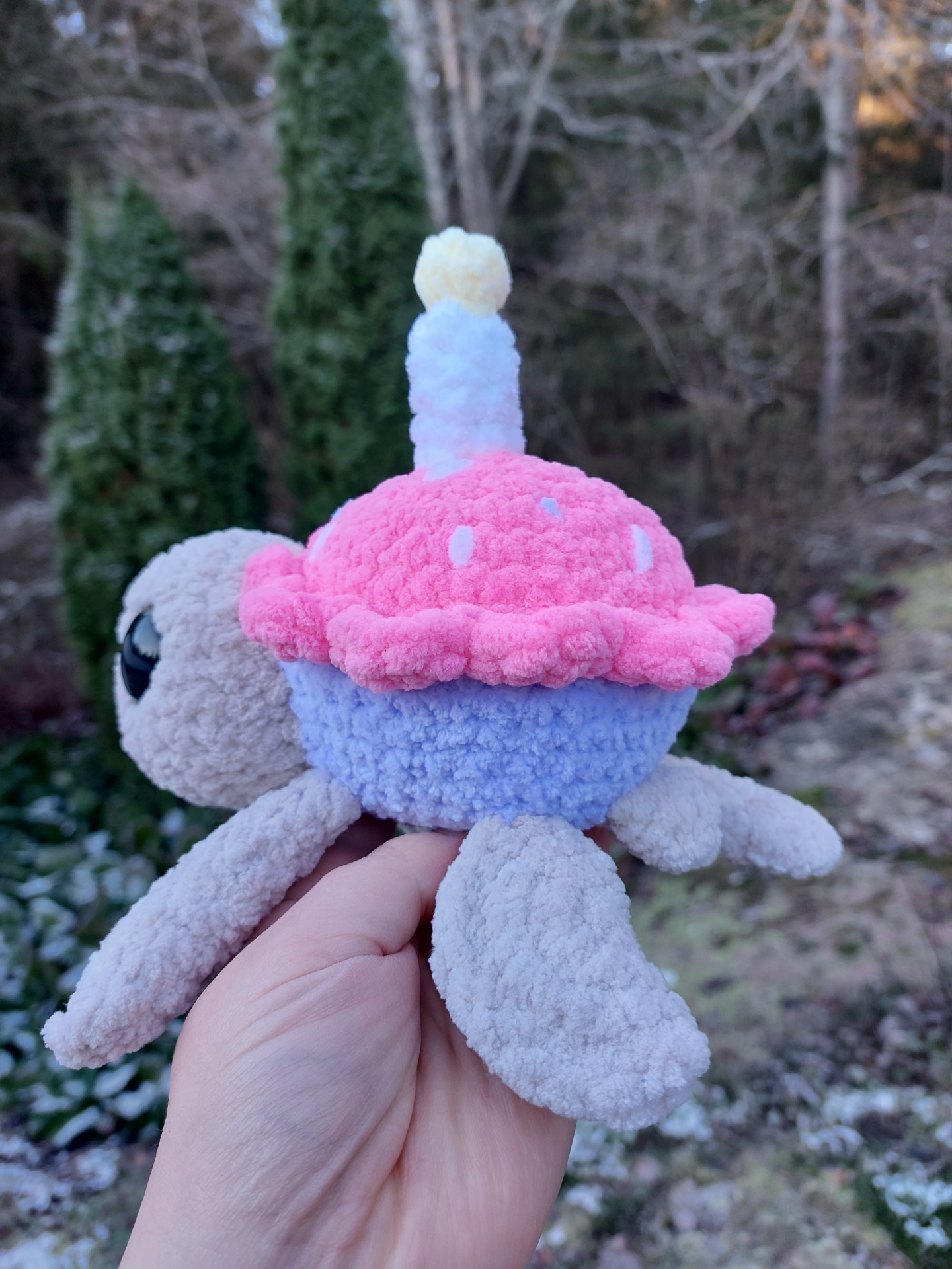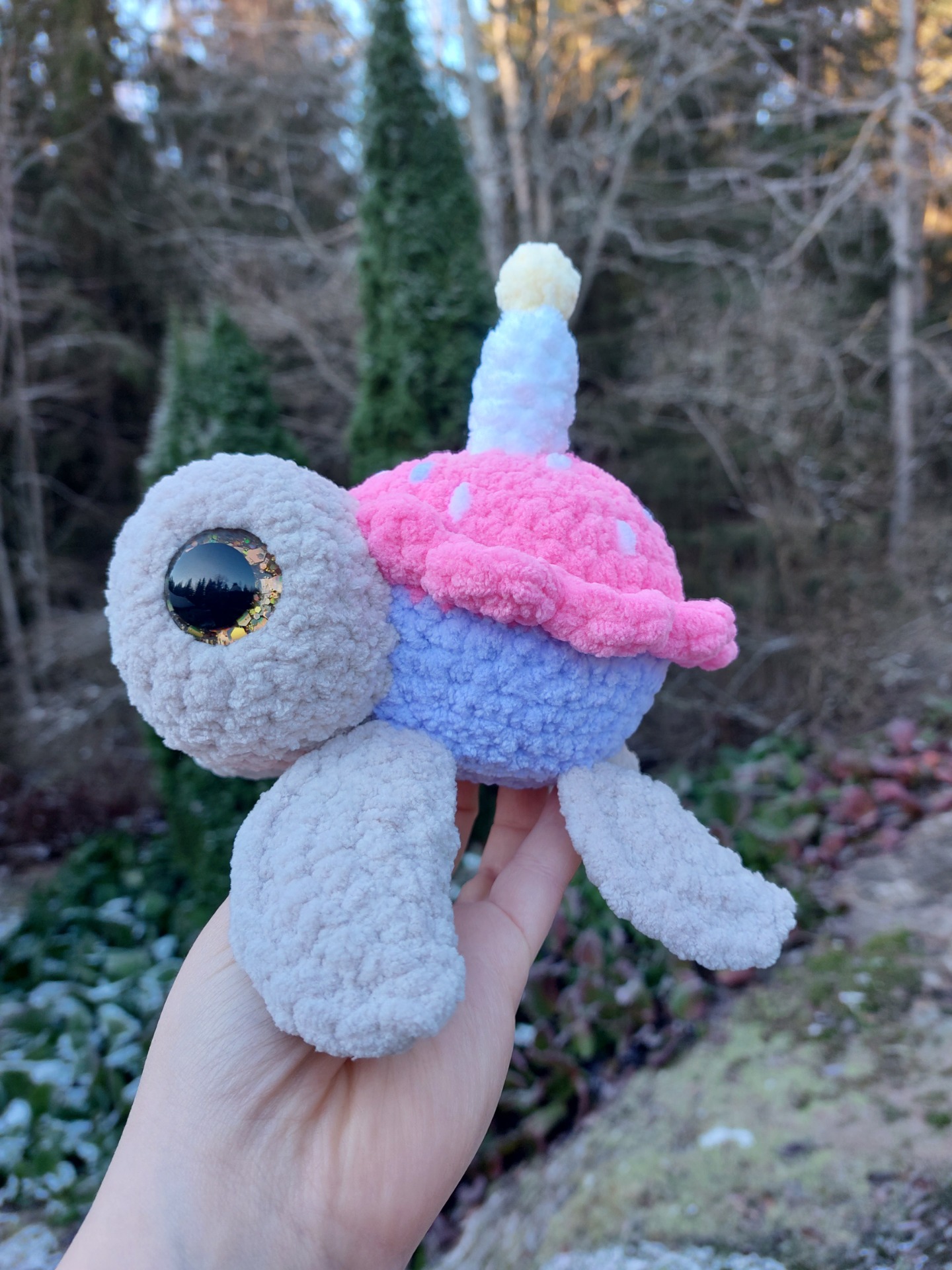 Merikilpikonna pehmolelu isoilla kimaltavilla kultaisilla käsin maalatuilla glitter silmillä. Kilpikonnan vartalo on kuppikakku, päällä on strösseliä ja synttäri kynttilä. Langalla Oeko-tex sertifikaatti ja täytevanu soveltuu myös allergikoille.