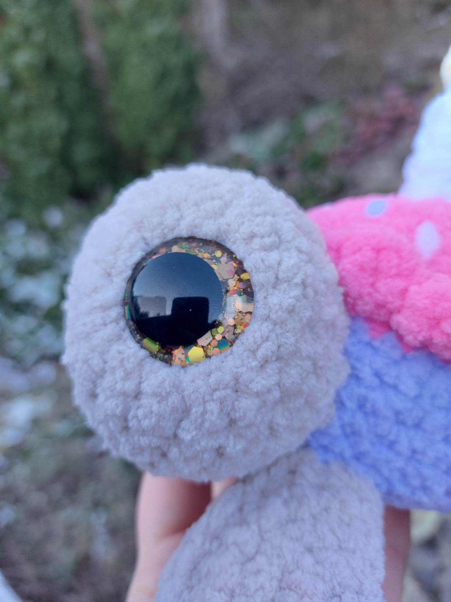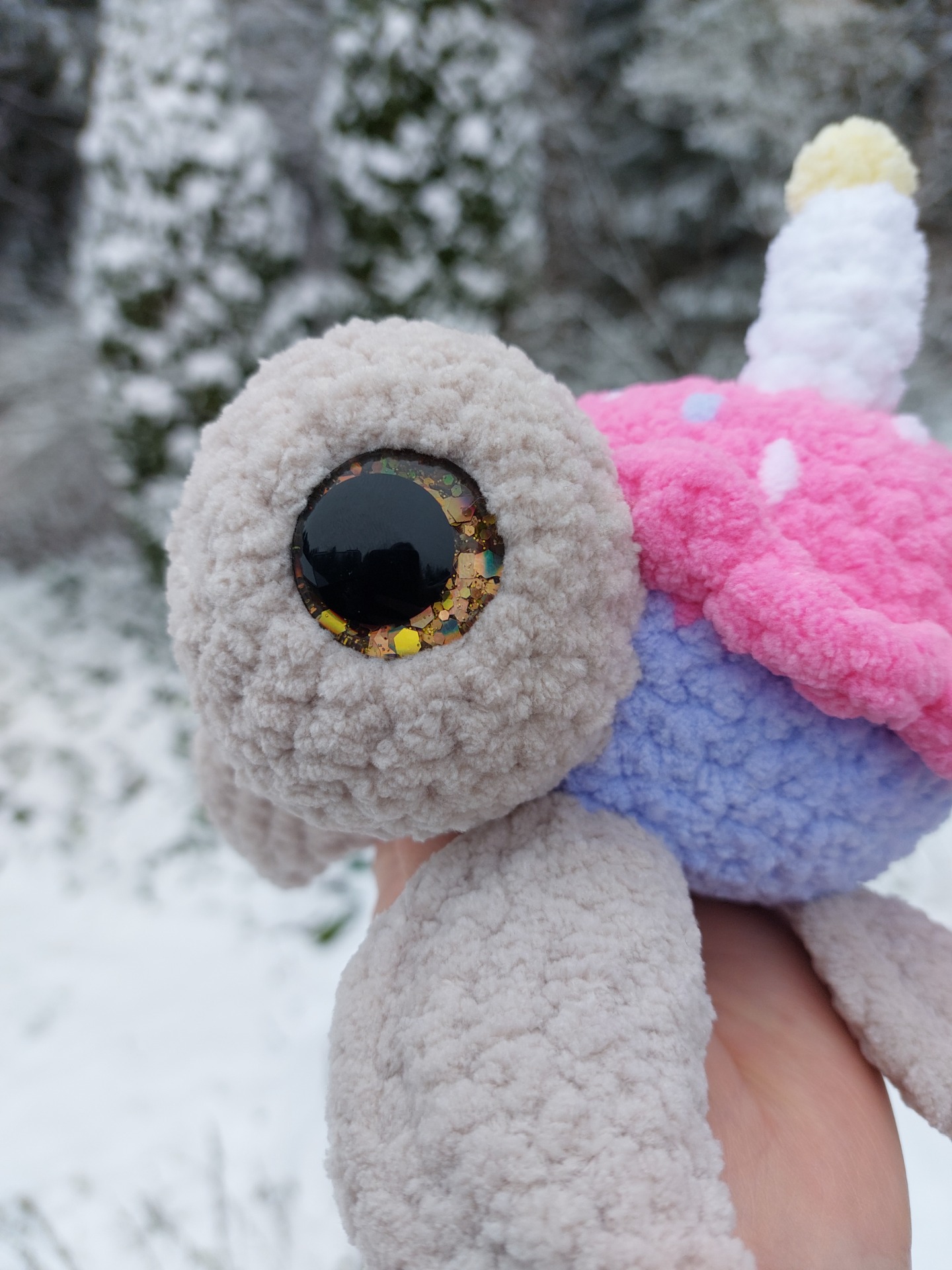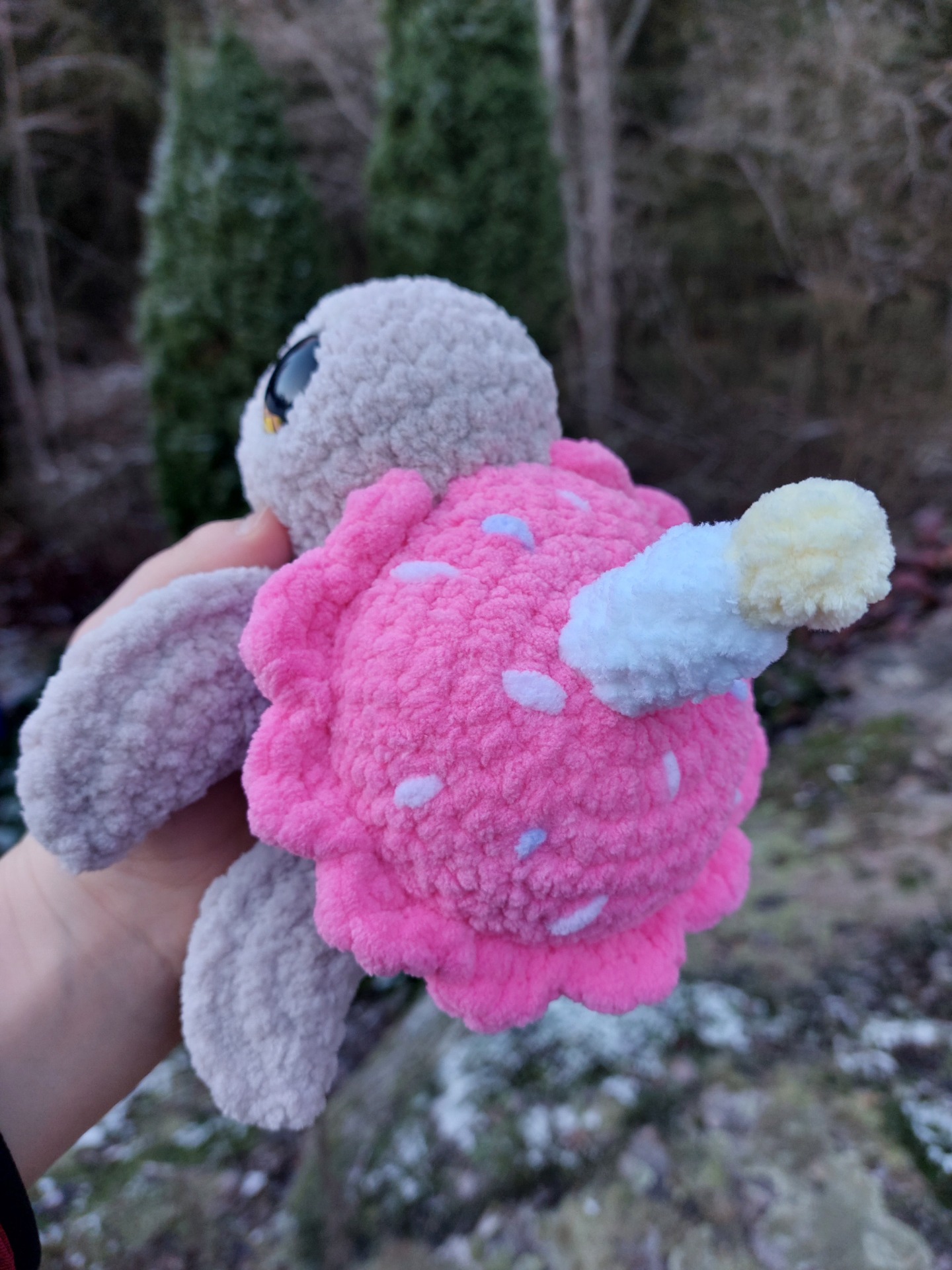 Merikilpikonna pehmolelu isoilla kimaltavilla kultaisilla käsin maalatuilla glitter silmillä. Kilpikonnan vartalo on kuppikakku, päällä on strösseliä ja synttäri kynttilä. Langalla Oeko-tex sertifikaatti ja täytevanu soveltuu myös allergikoille.