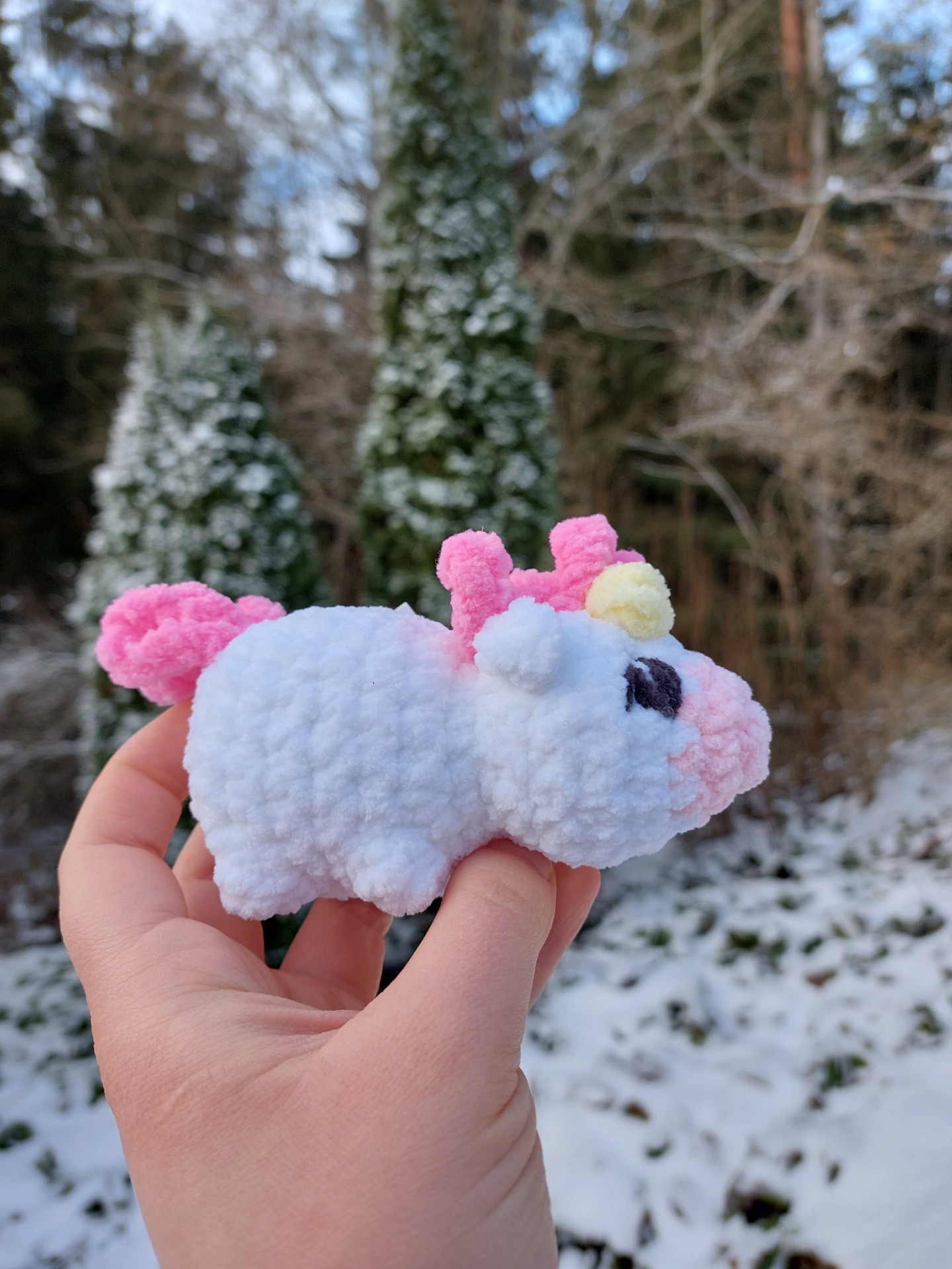Pieni yksisarvis pehmolelu vauvaturvallisilla lankasilmillä. Langalla Oeko-tex sertifikaatti ja täytevanu soveltuu myös allergikoille.